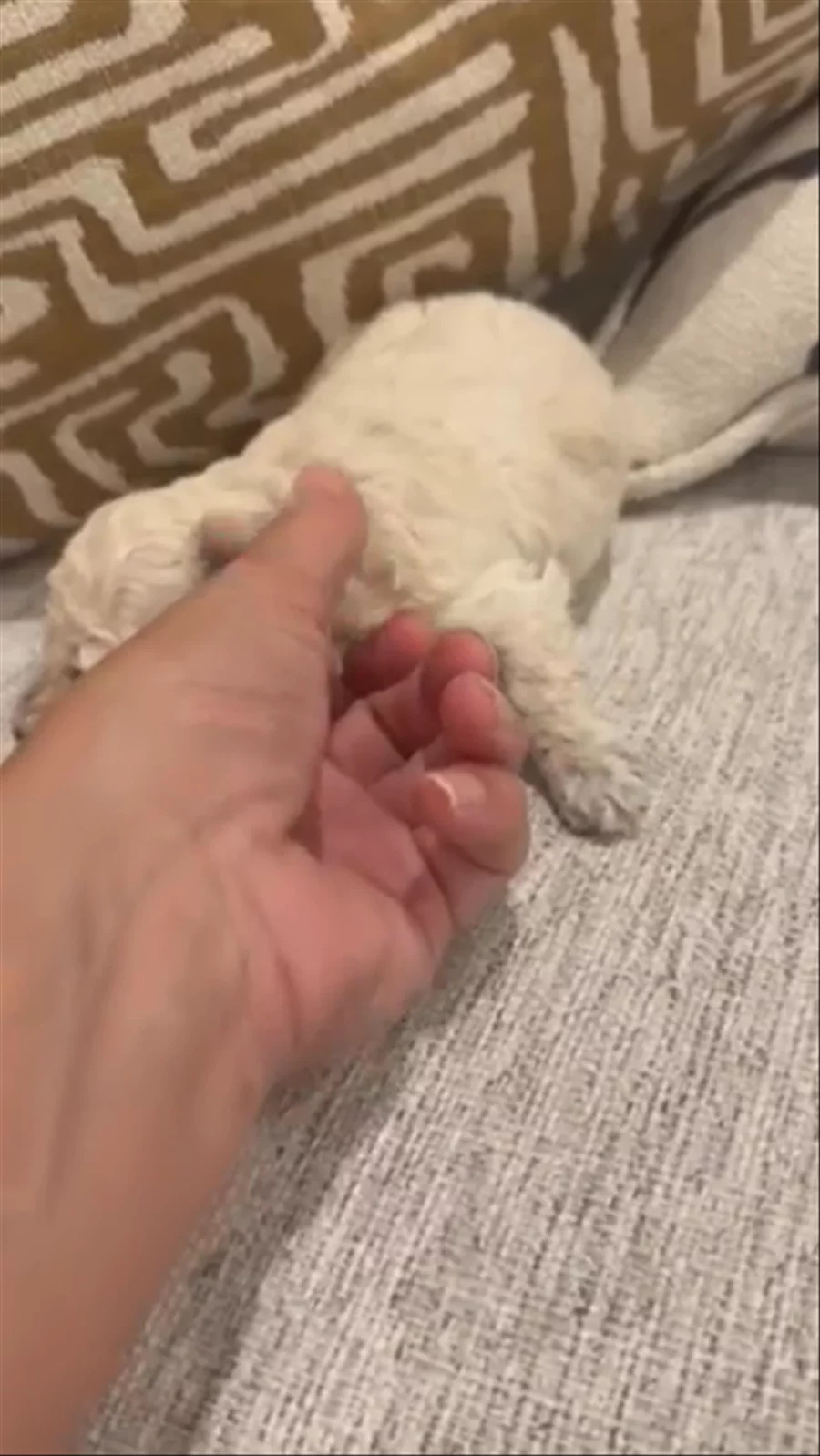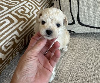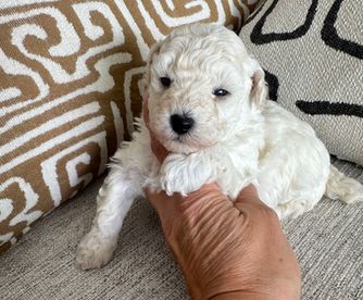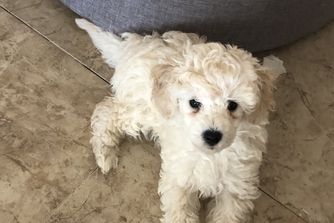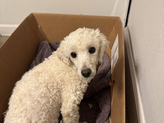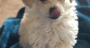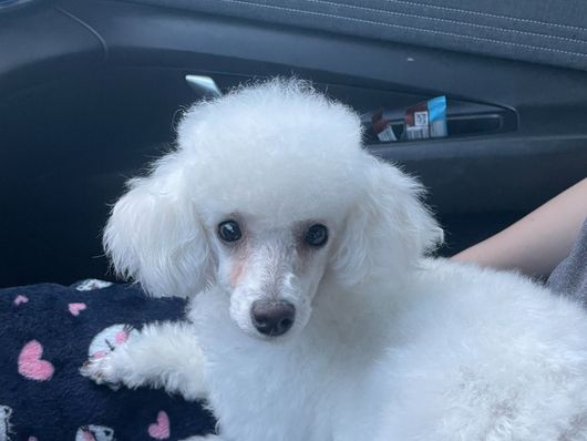 Paris is an AKC toy poodle. She’s ice white with no tear stains. She’s active and loves to cuddle