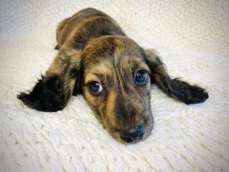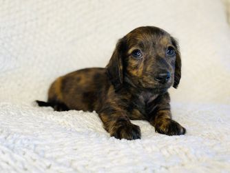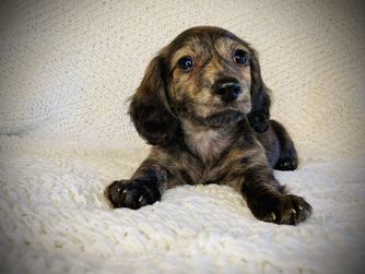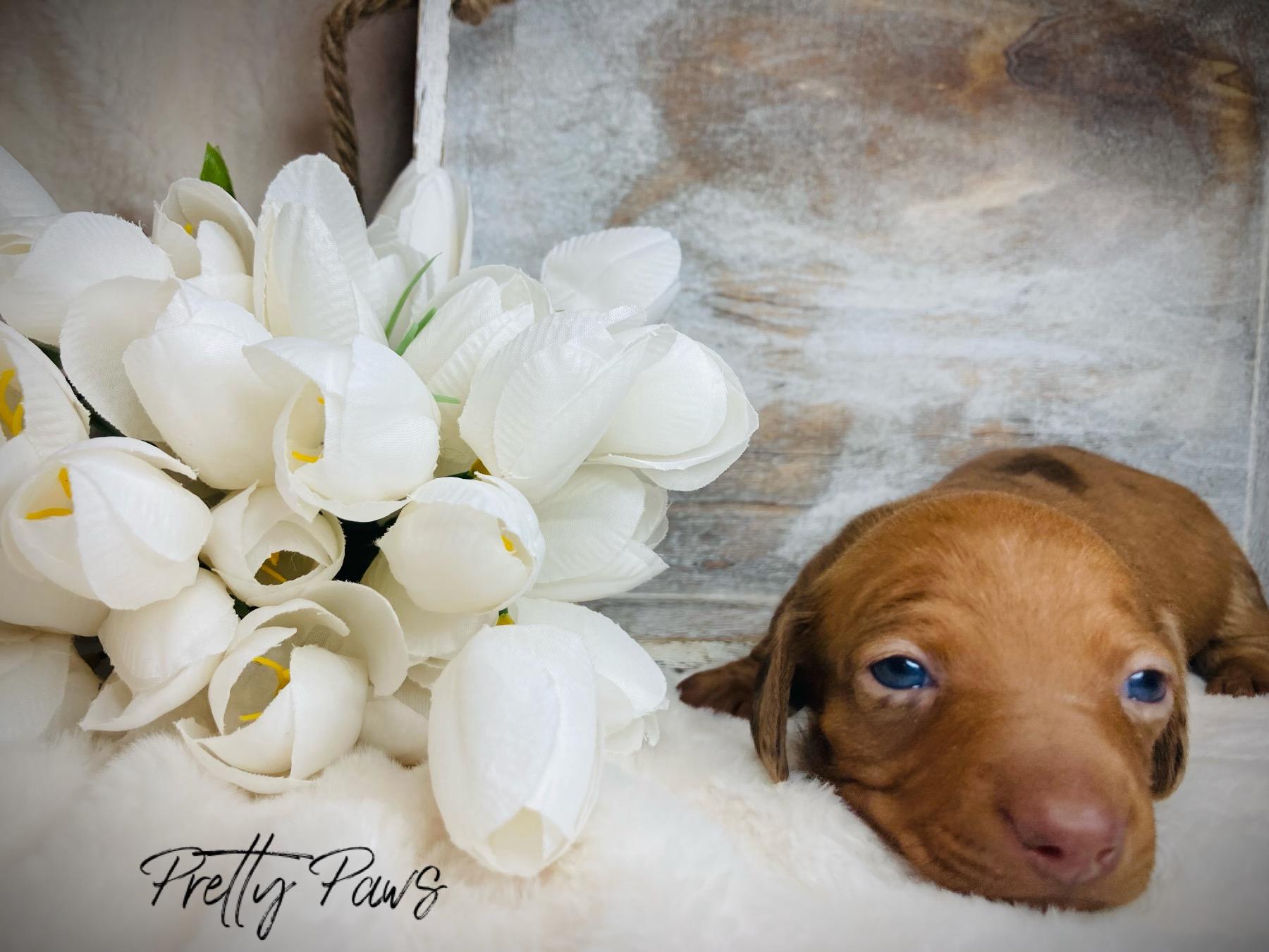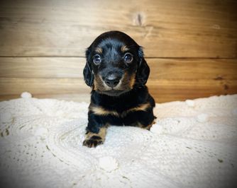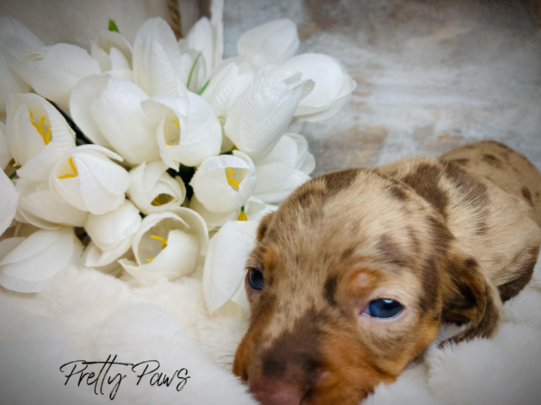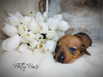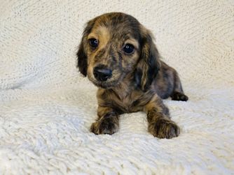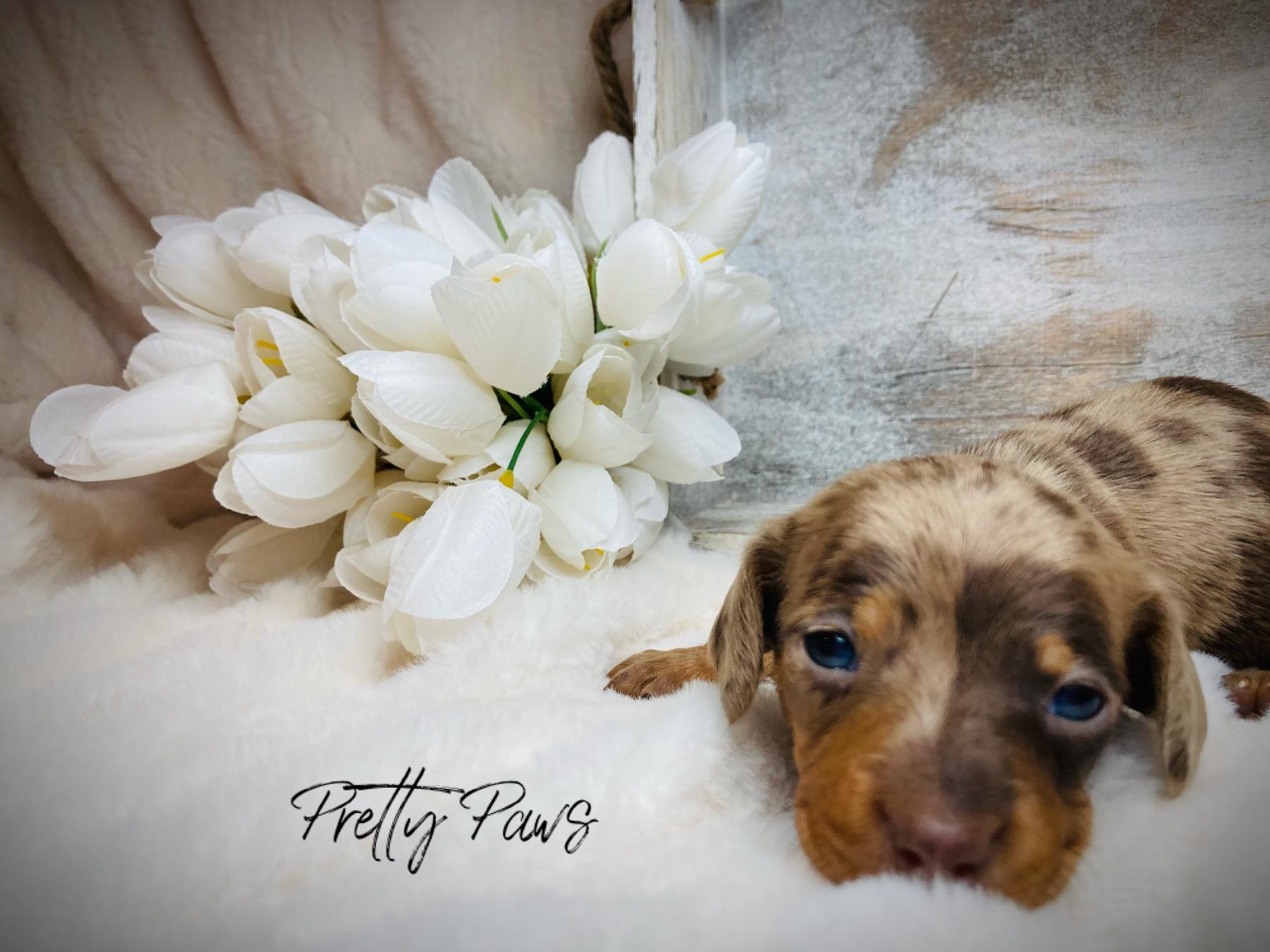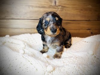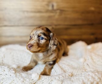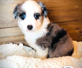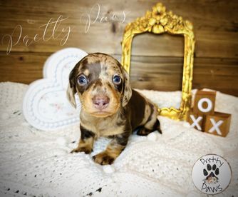 Miniature Australian Shepherd puppies include black & white, blue merle, and red tri. Dachshund puppies include piebald, cream, black and tan, and dapple. Colors will vary depending on the parent dogs.