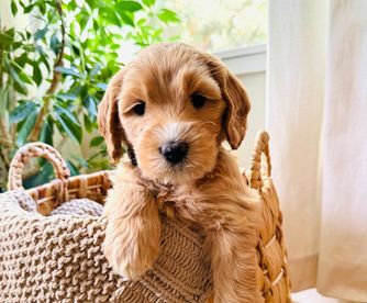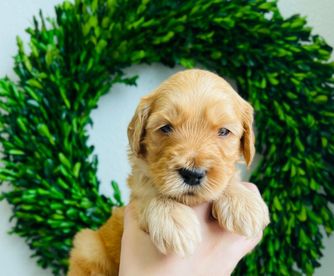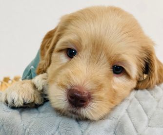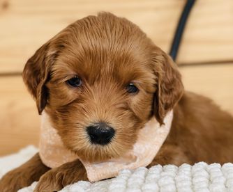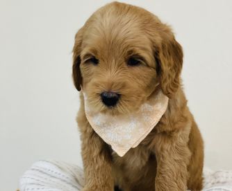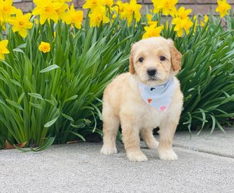 Daisy is a medium apricot girl with a white chest. She loves to run around all day long with her siblings on the farm. She loves to cuddle up at the end of the day on your feet or even your lap. She is perfectly happy to spend all day outside playing or spend all day inside lounging having a relaxing day. She has such a sweet demeanor that is also very playful. She has a soft wavy coat and bright black nose.