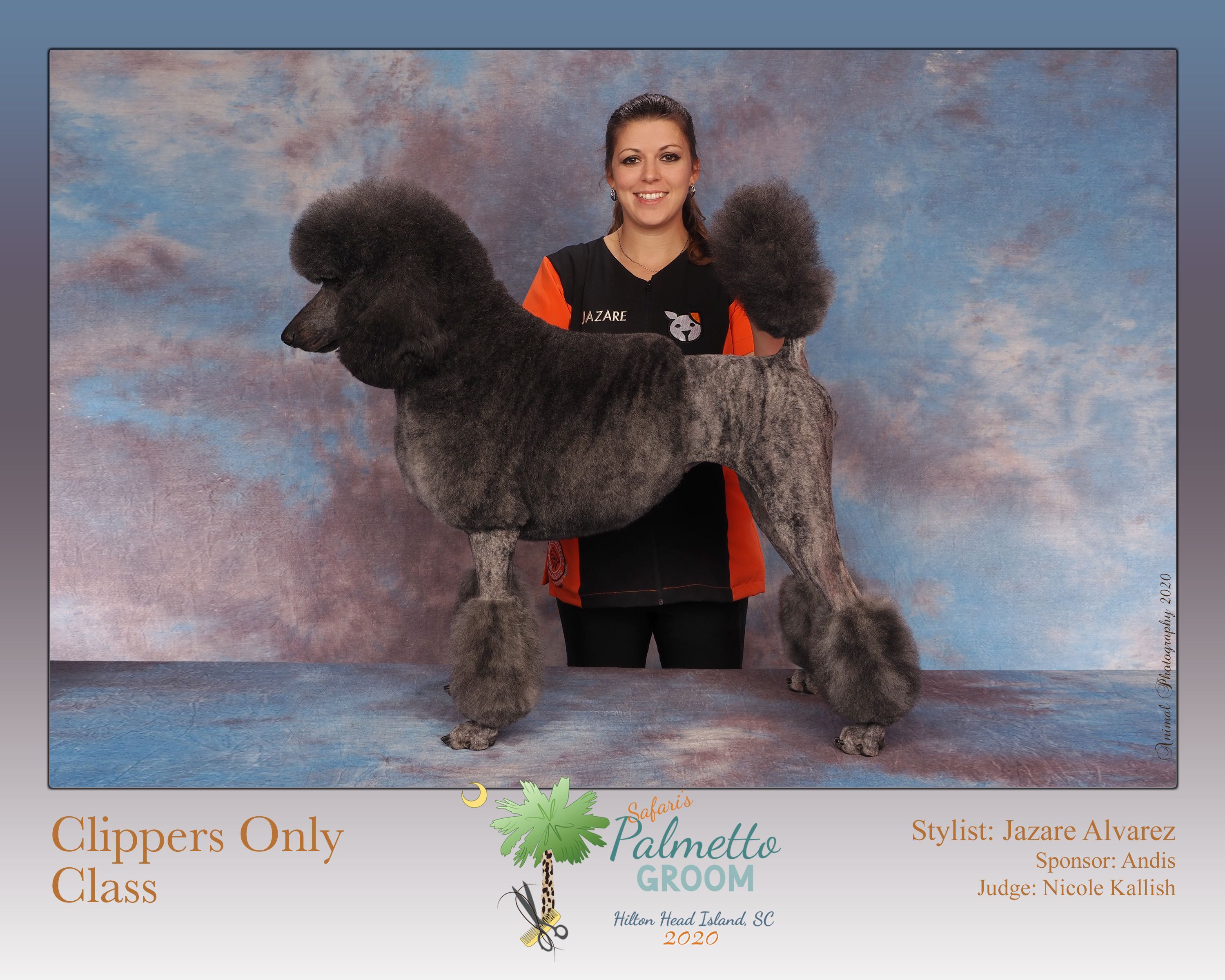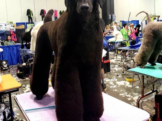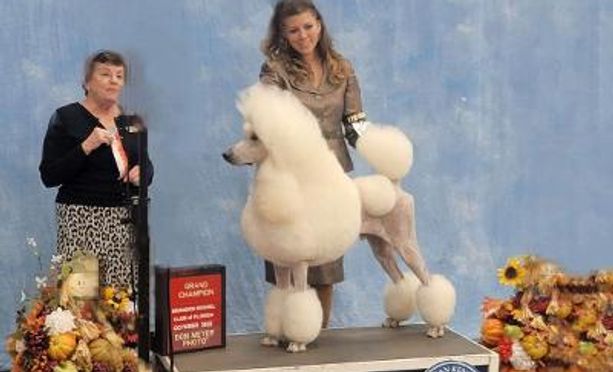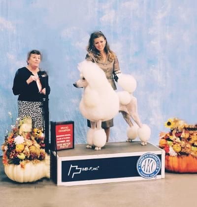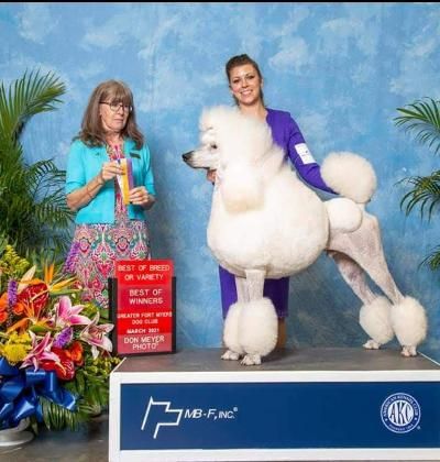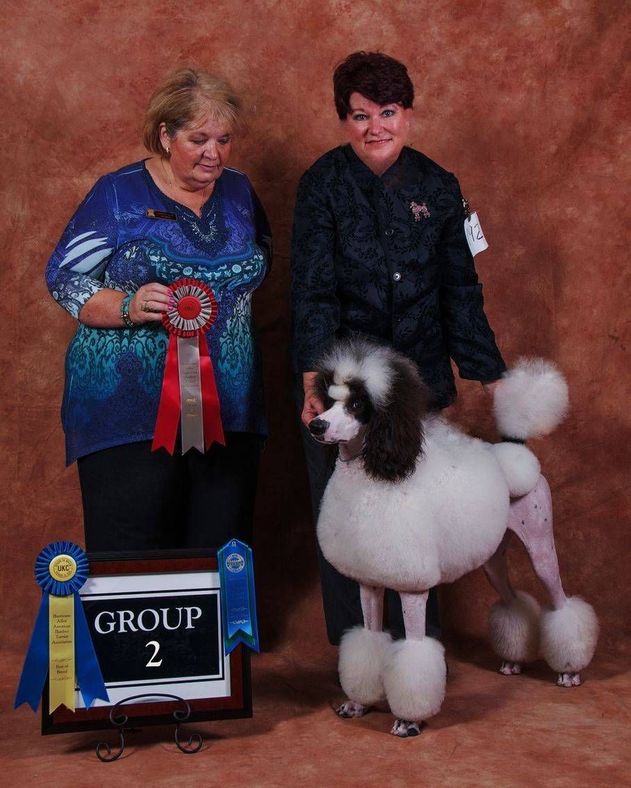 My daughter and I have shown & bred Standard Poodles for 19 years producing sound, healthy pups, free of genetic disorders. We have many that enter in grooming competitions for their dense show coats, structure & table manners. "Matrix," white stud is our 4th generation, and was shown exclusively by my daughter, Jazare Alvarez in AKC as Owner/Handler, Bred By, and now is a AKC AM GRCH.