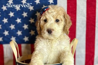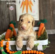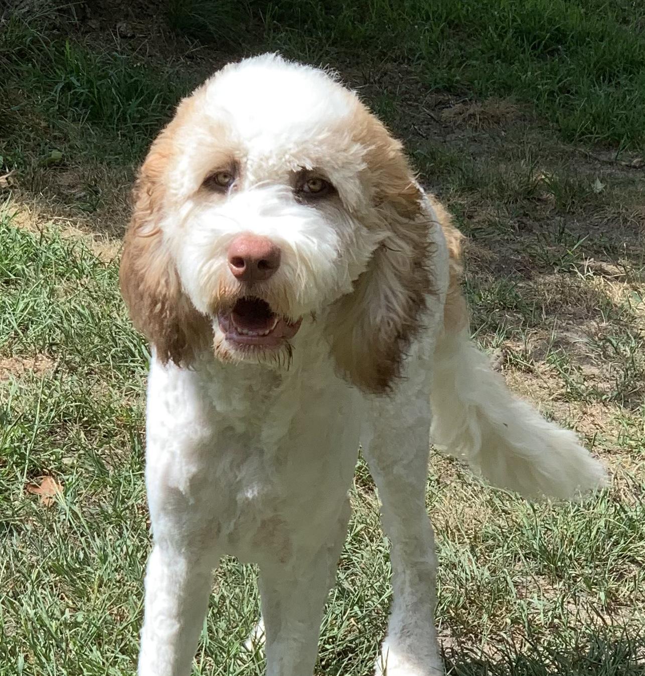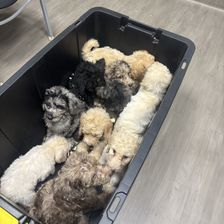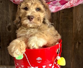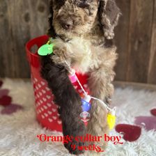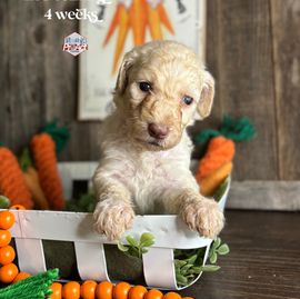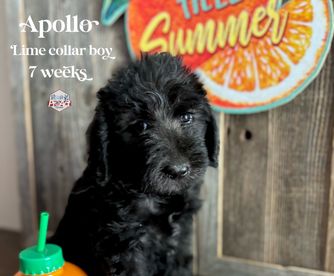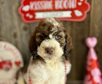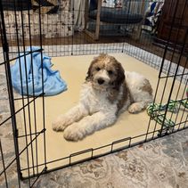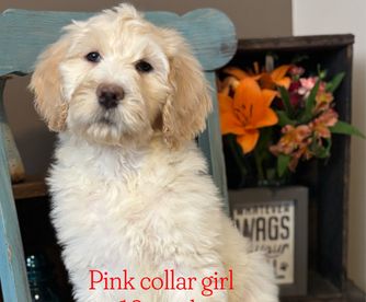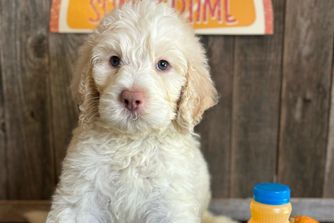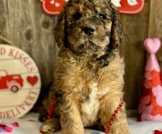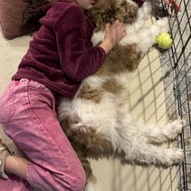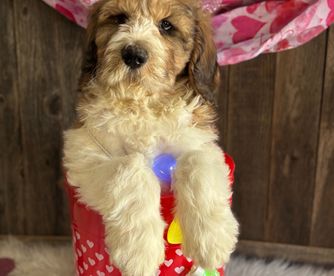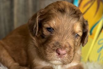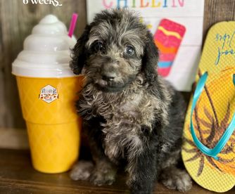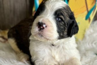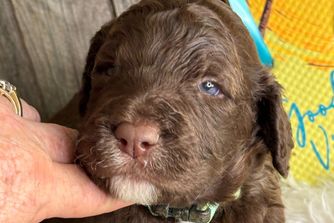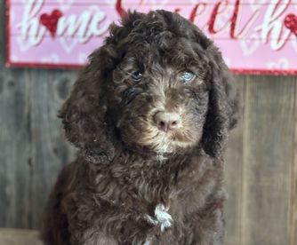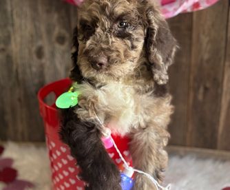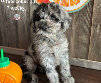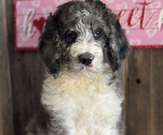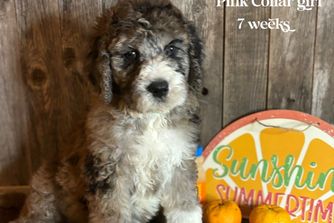 Our Labradoodle puppies include merle, caramel, apricot, cream, chocolate, and black. Saint Berdoodle puppies include sable, parti, merle-sable, merle, and brown and white. Colors will vary depending on the parent dogs.