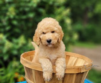 Goldendoodle puppies include miniature and standard sizes. Poodle puppies are standard size. Sheepadoodle puppies include miniature and standard sizes. Sizes will vary depending on the parent dogs.