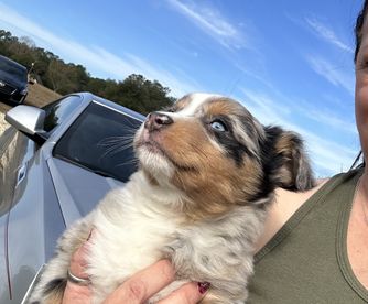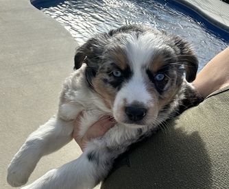Tucker is a beautiful tri-coat male Miniature Australian Shepherd. He is from the American Stock Dog Registry. He has produced several healthy litters but this will be the first time with Lucy. We are so excited to see the litter as they are the perfect combination. He has bred another blue Merle female and I have cross bred him with a cream colored Goldendoodle this producing Aussiedoodles!