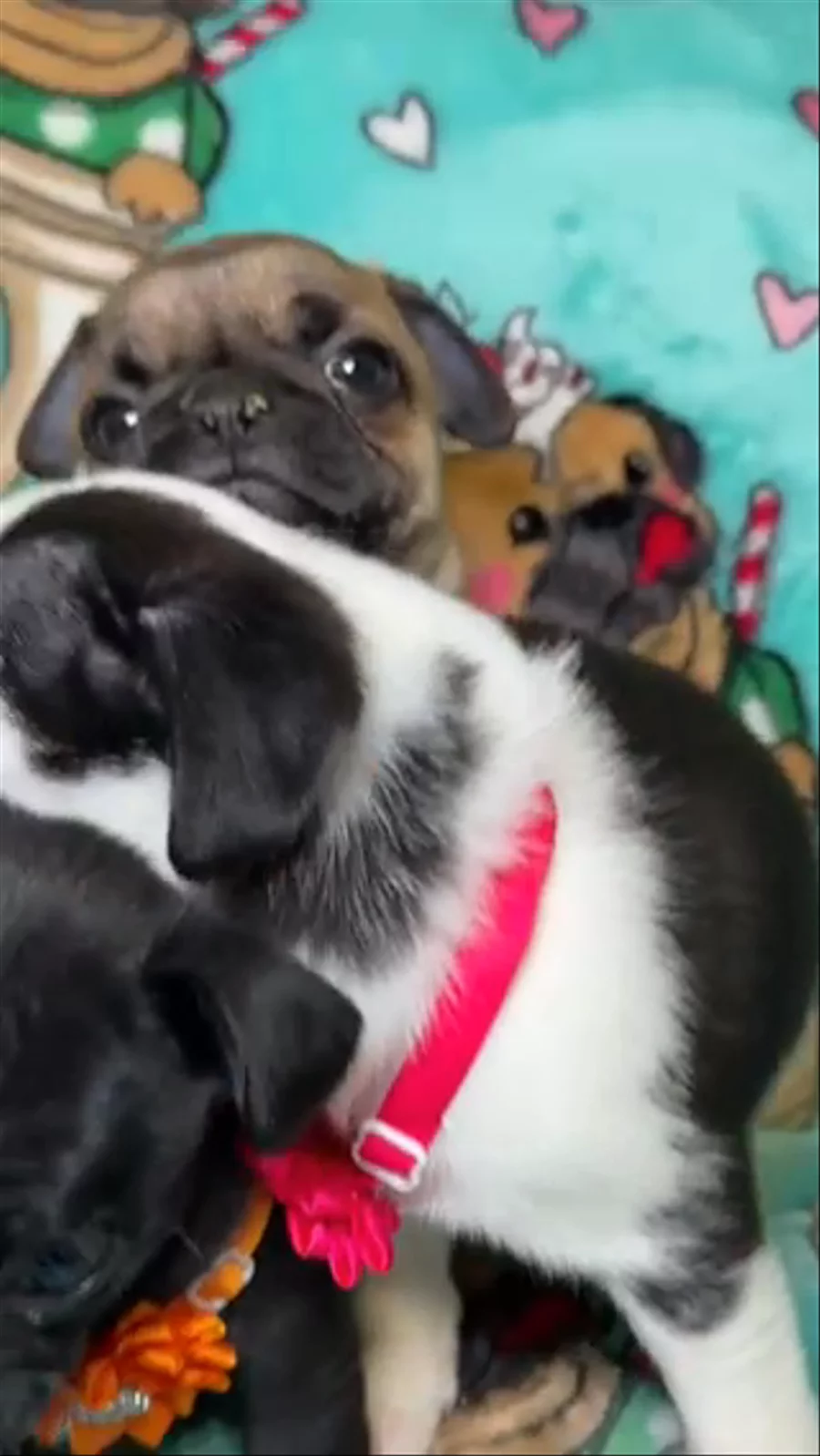 Pug puppies include black, fawn, and brindle. Colors will vary depending on the parent dogs.