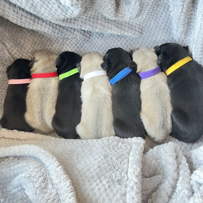 Our puppies include black and fawn. Colors will vary depending on the parent dogs.