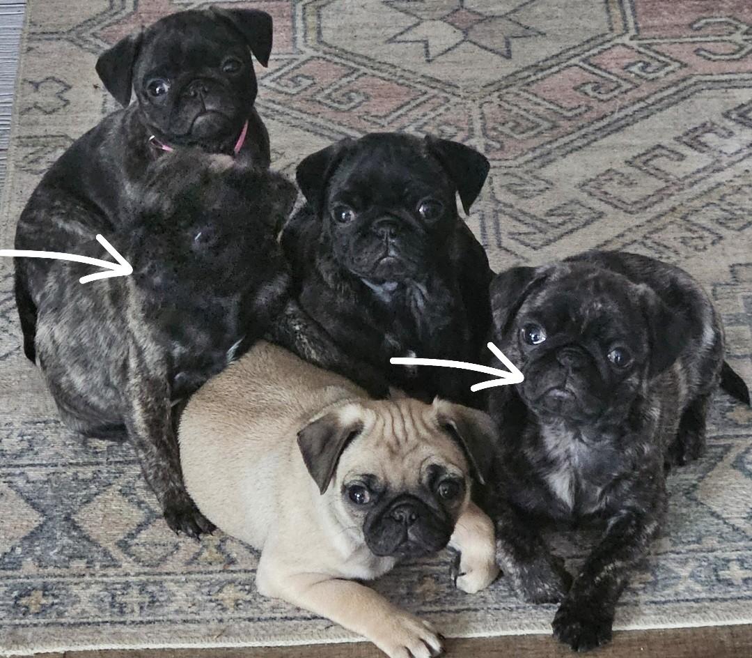 First litter was accidental but what a lovely accident! We have a fawn male and a brindle female. Only 1% of pugs are Brindle so not only rare but also beautiful! Loving, cuddly, and playful.