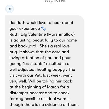Ruth was great. She was super quick in responding and very knowledgeable about the breed. Our pup is doing great and we were supper happy to add a new family member!