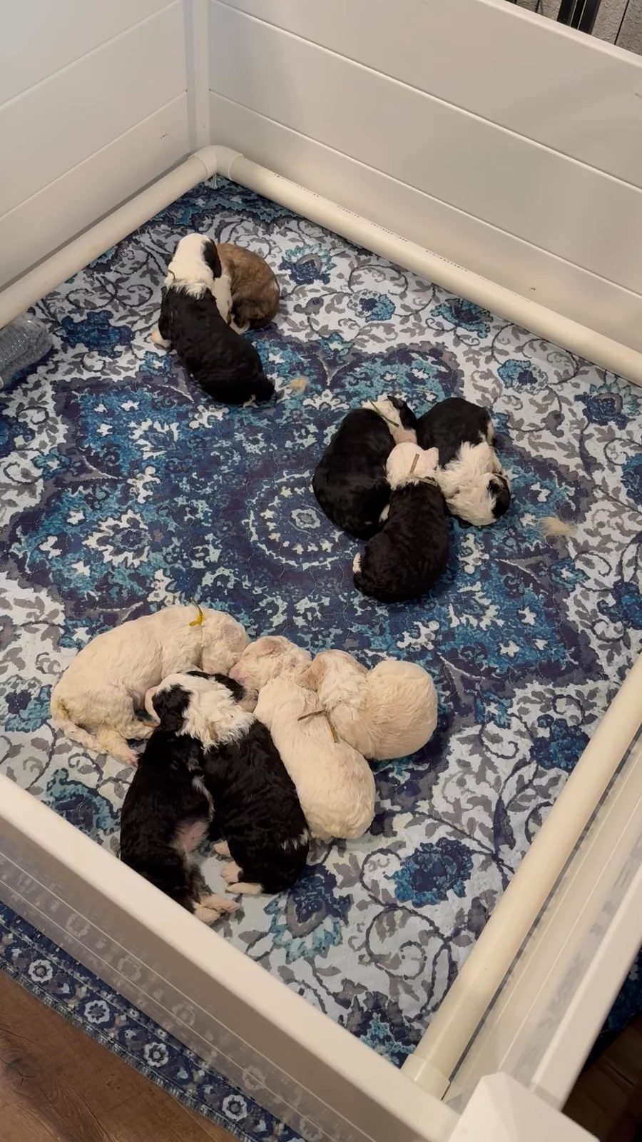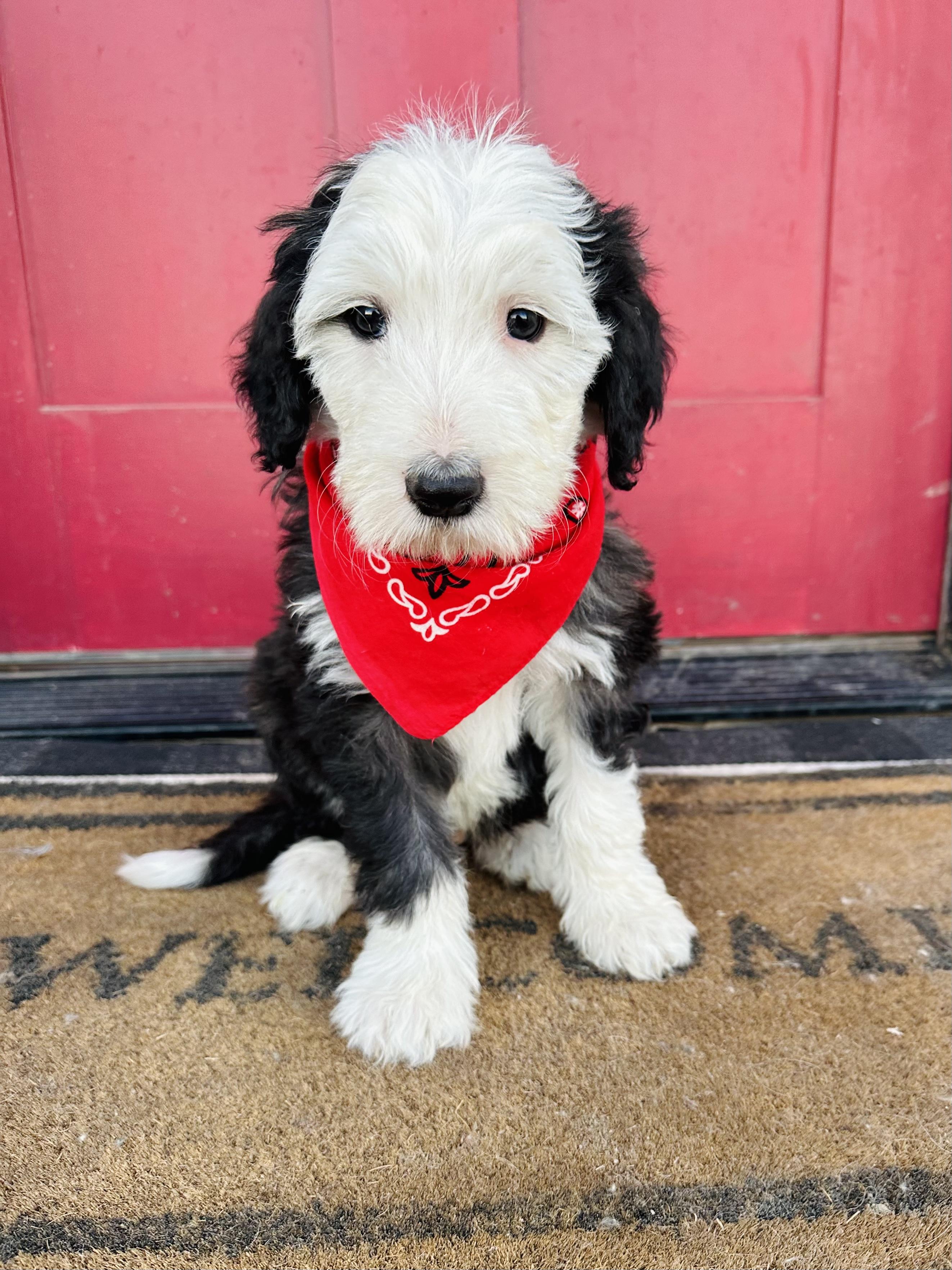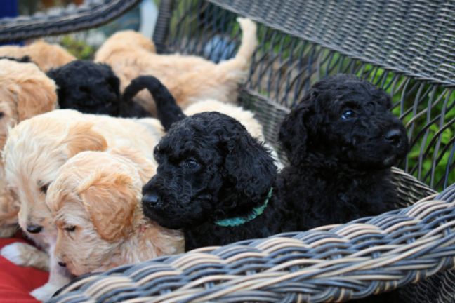 Our Goldendoodle puppies include cream, apricot, red, chocolate, black, merle, and parti. Sheepadoodle puppies are black and white. Poodle puppies include red and parti. Colors will vary depending on the parent dogs.