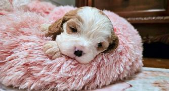 Our Cavapoo puppies include cream, red, blenheim, and apricot. Cavalier King Charles Spaniel puppies include blenheim, ruby, tri-color, and black and tan. Colors will vary depending on the parent dogs.