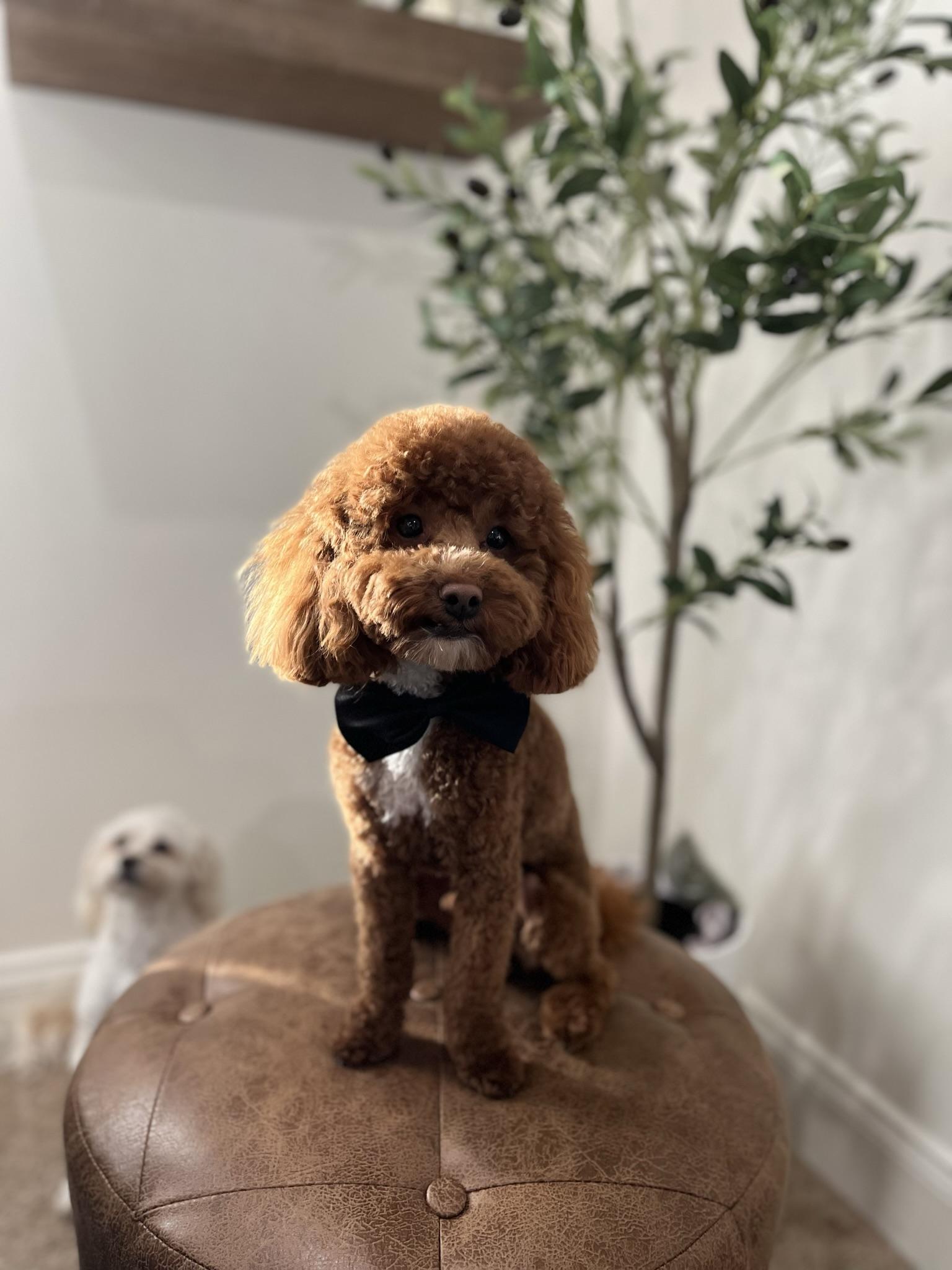 Charlie is a handsome red parti toy poodle with white abstract markings on his chest. He is very smart, excellent at independent play and loves to snuggle.