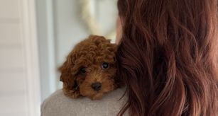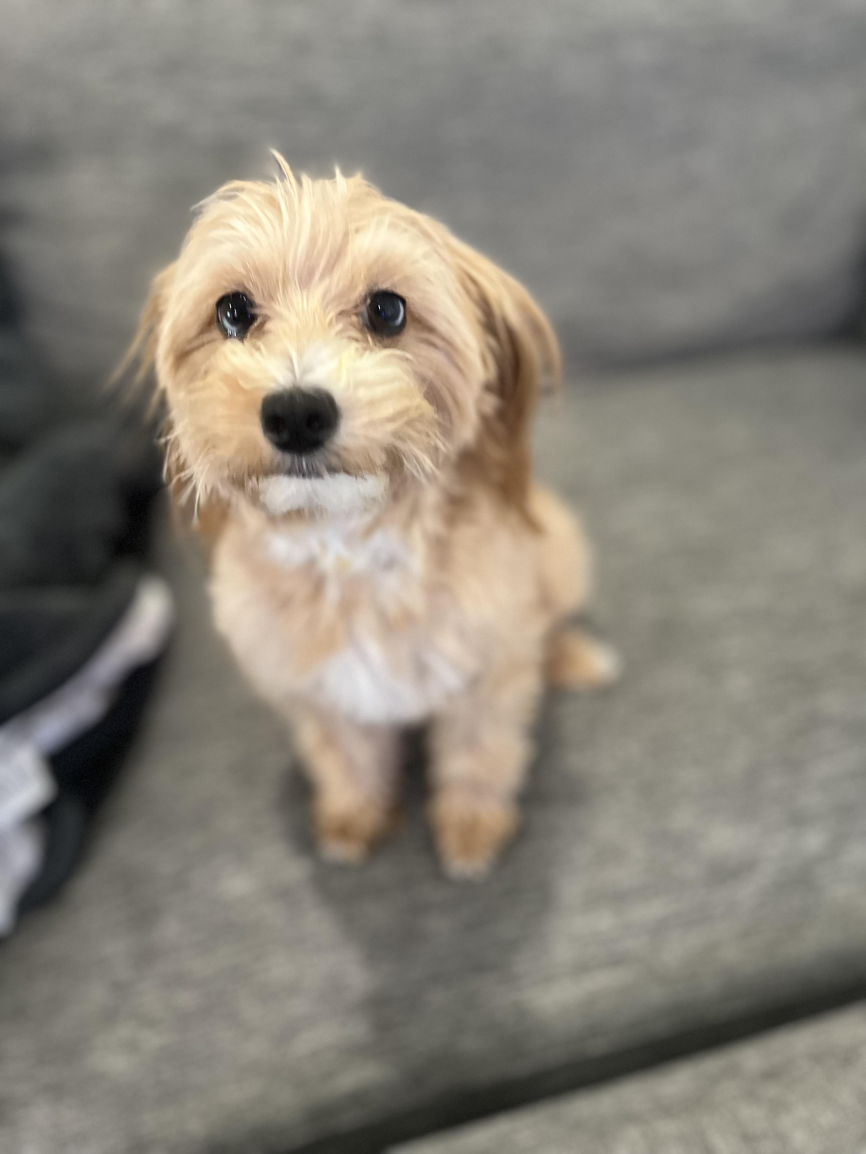 Dahlia is a beautiful apricot Maltipoo with a white chest. She is very smart and loves to snuggle under the blankets.