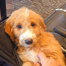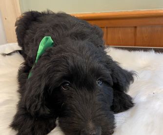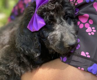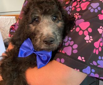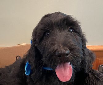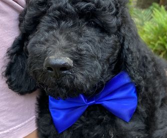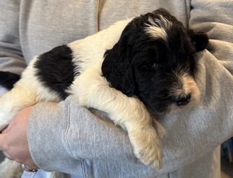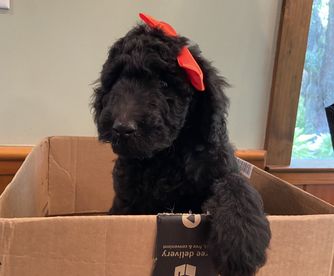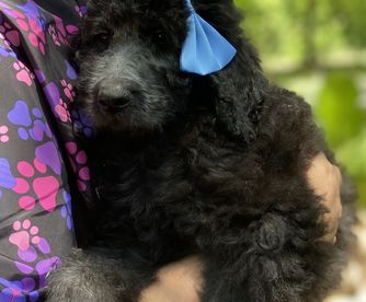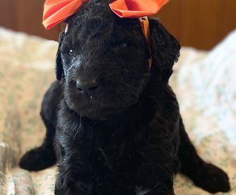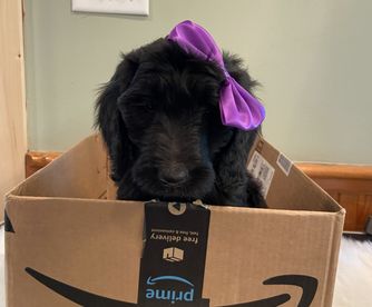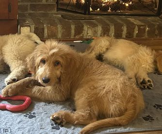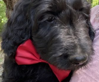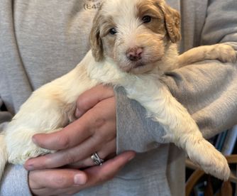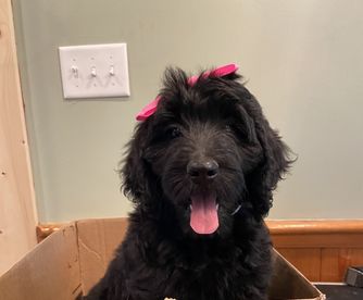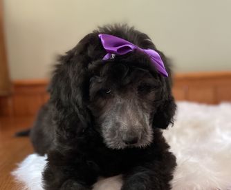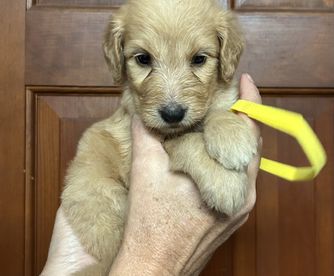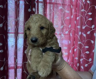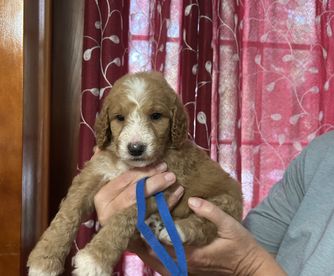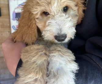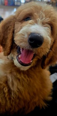 Mary is a very loyal and loving doodle. She had bonded with my son and is his best friend and little gradian angel. She is a beach loving water dog. Who doesn't shed and has amazingly soft hair that has a slight wave but not the fuzzy curly hair communally see a goldendoodle have.