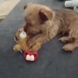 Libby loves toys, especially squeaky toys. She loves to watch me do my office work and hang out on my lap. She also adores Puperoni treats.