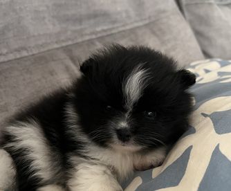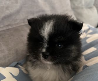 Pomeranian puppies include black and tan parti, chocolate, tri-colored, and chocolate sable. Colors will vary depending on the parent dogs.