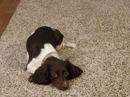 Oakley is our chocolate and tan piebald. She is spunky and super sweet. She is my shadow and must be wherever I am.