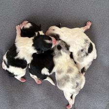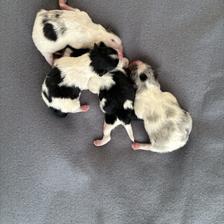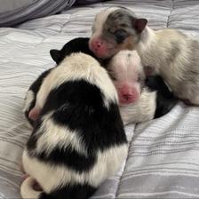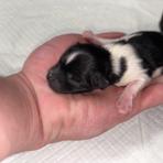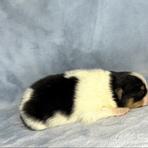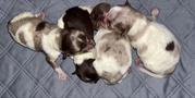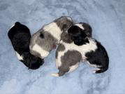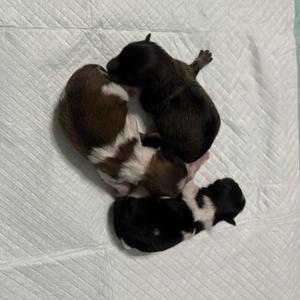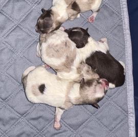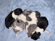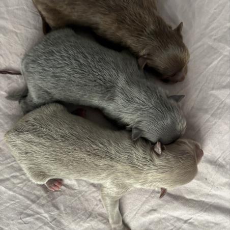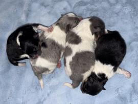 We have 2 boys and 1 girl in our new litter! A beautiful blue Merle Parti Tri female, mostly blue Merle Parti Tri male, and then a black Tri male 😊