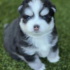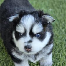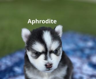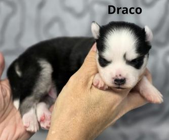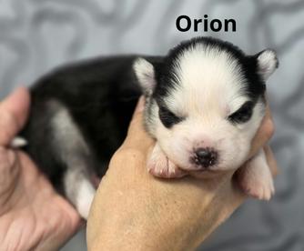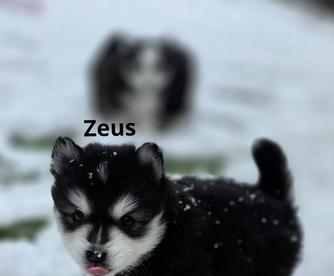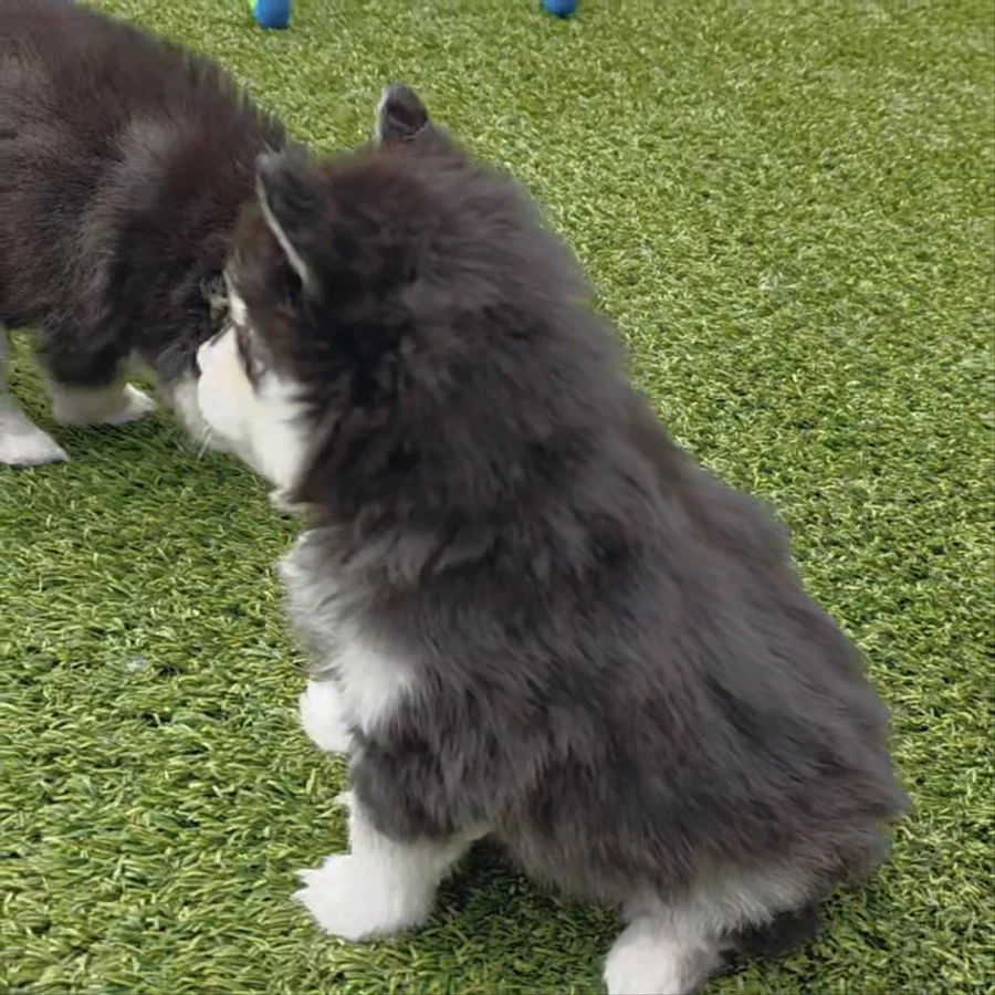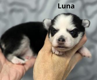 Rose is a gorgeous black and white F3 Pomskies weighing in at 14lbs with striking blue eyes.