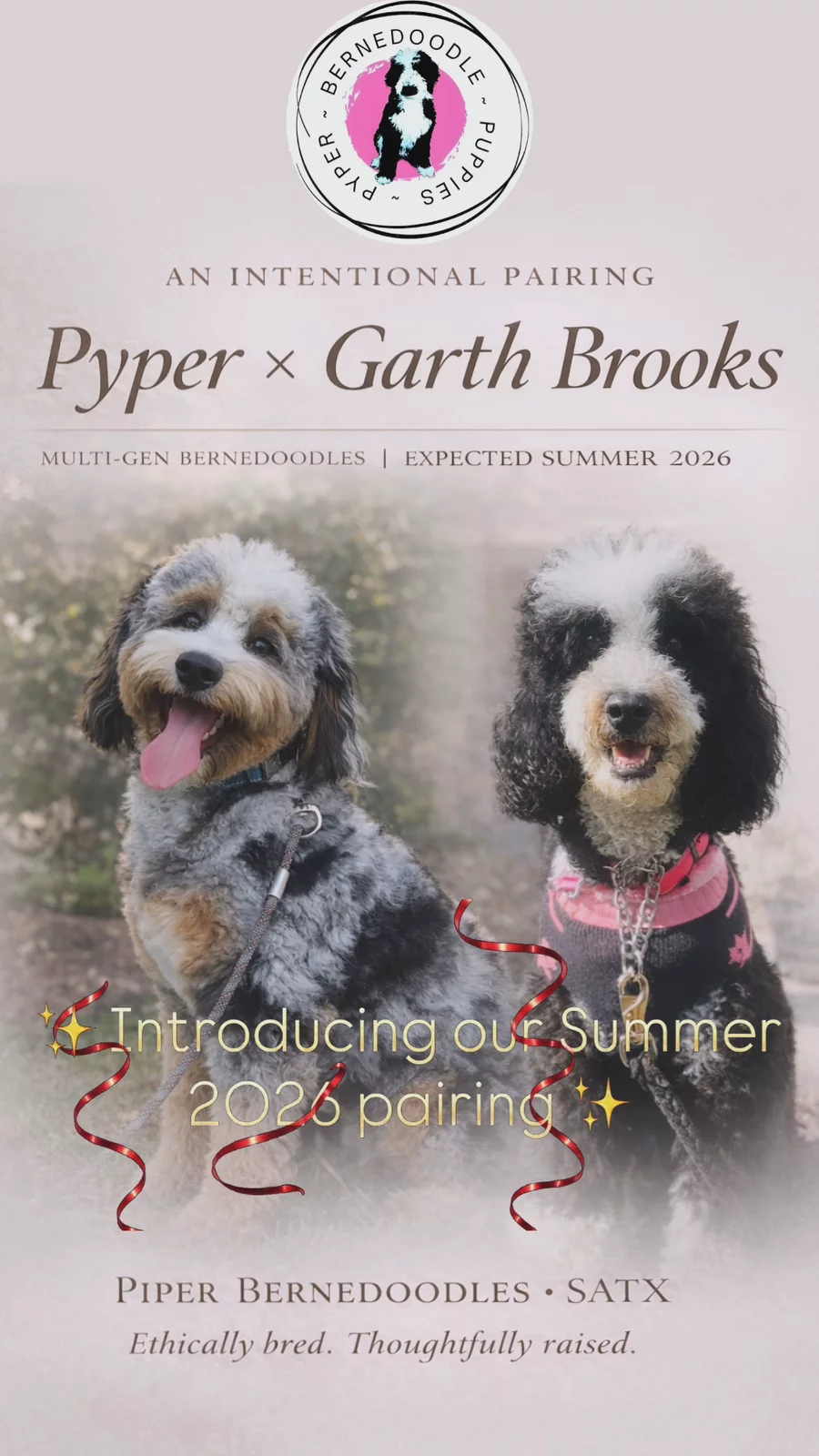 ITS OFFICIAL!!! Our next litter pairing is scheduled for THIS SUMMER ☀️2026! 🐶Pyper + 🐶Garth Brooks are going to make the most beautiful precious Bernedoodle Fur Babies and our WAITLIST is now open! Pyper and Garth Brooks were chosen not just for their beauty, but for their health, temperament, and genetic compatibility. Together, they represent everything we stand for—ethical breeding, thoughtful planning, and puppies raised to become cherished family members. ✅ Exceptional genetics. ✅ Rare merle possibilities. ✅ Medium-sized family companions (35-45 pounds fully grown) We’re quietly preparing for their Summer 2026 litter, and welcoming early inquiries from families who understand that the best things are never rushed. 🐾 Pyper Bernedoodles SATX - bred with intention, never by accident. ✈️ FLIGHT NANNY SERVICES AVAILABLE ANYWHERE IN THE US.