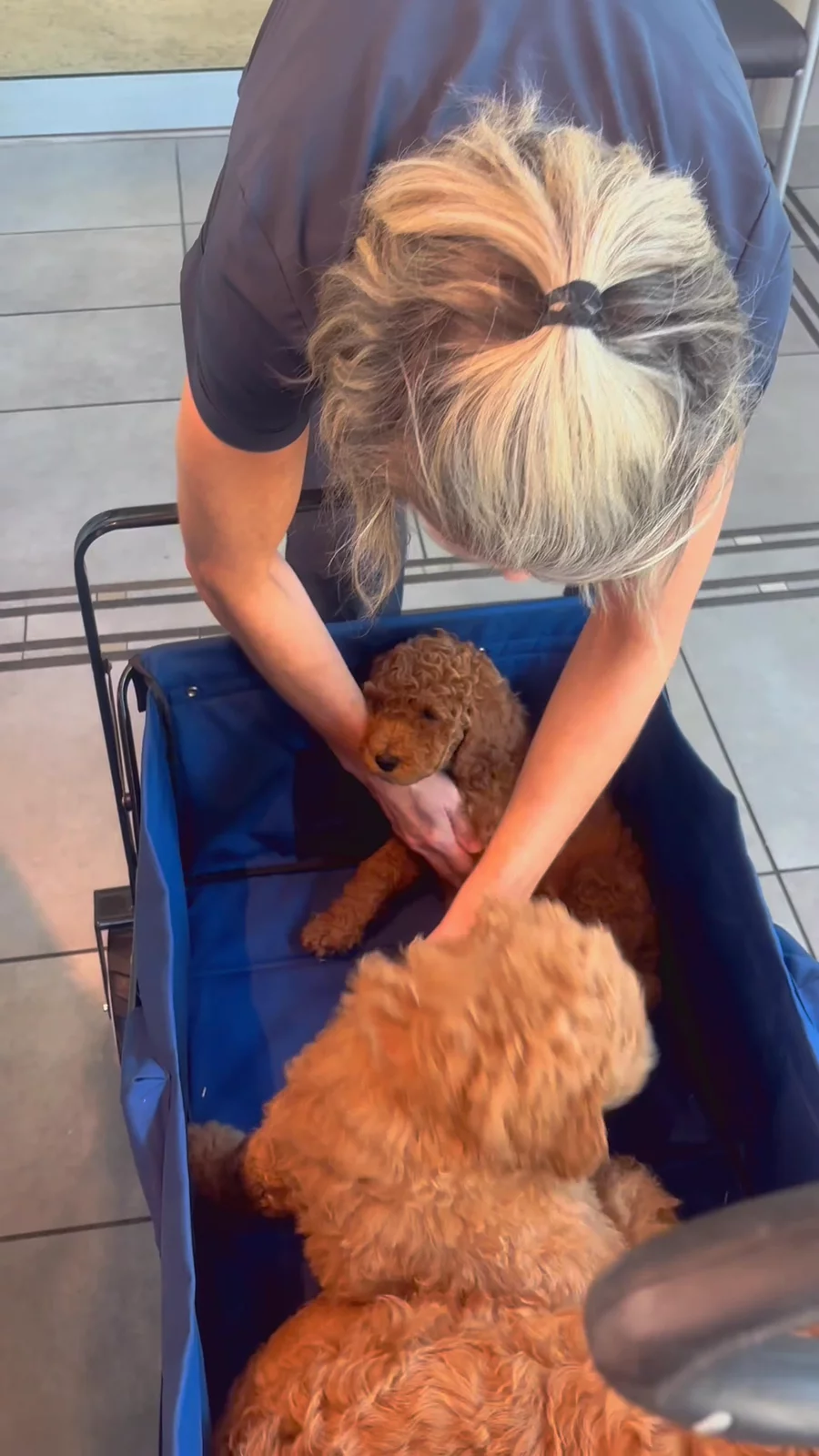 “Your puppy receives a health exam by our trusted veterinarian. Puppies go home with core vaccines, deworming and parasite prevention a well as socialization, potty training, and crate introduction. This deposit secures your spot on our waitlist and goes toward the final purchase price. Deposits are non-refundable but may be transferred to a future litter if needed.”