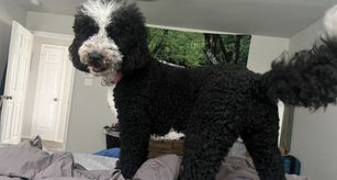 Pyper is an F1B Bernedoodle- she is goofy, gentle and very well behaved mama. She loves to play, fetch and responds very well to all sorts of training. She is genetically and health tested with a perfect symmetry in black and white coloring. She is non shedding and hypoallergenic dog
