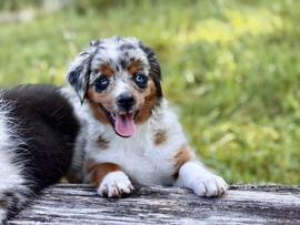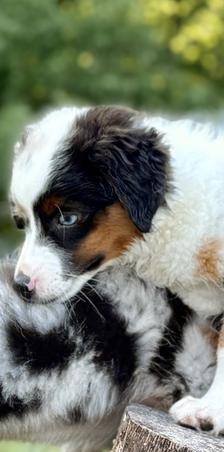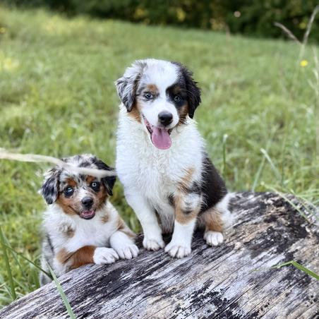 Our Miniature American Shepherd puppies include black tri and blue merle. Miniature Australian Shepherd puppies include blue merle and black. Colors will vary depending on the parent dogs.