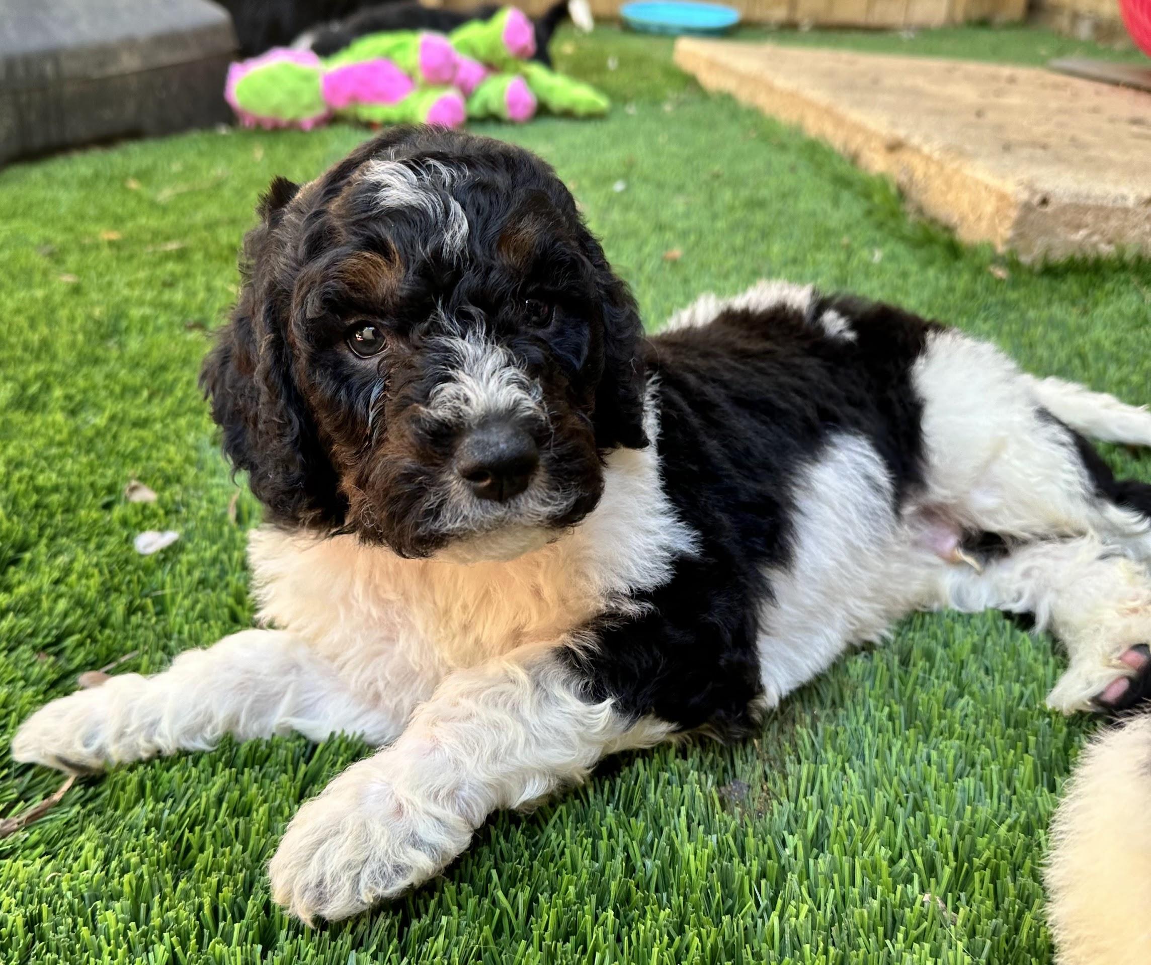 Our Bernedoodle puppies include sable, black and white, tri-color, phantom, and blue merle. Goldendoodle puppies include cream, apricot, red, chocolate, black, phantom, merle, and parti. Colors will vary depending on the parent dogs.