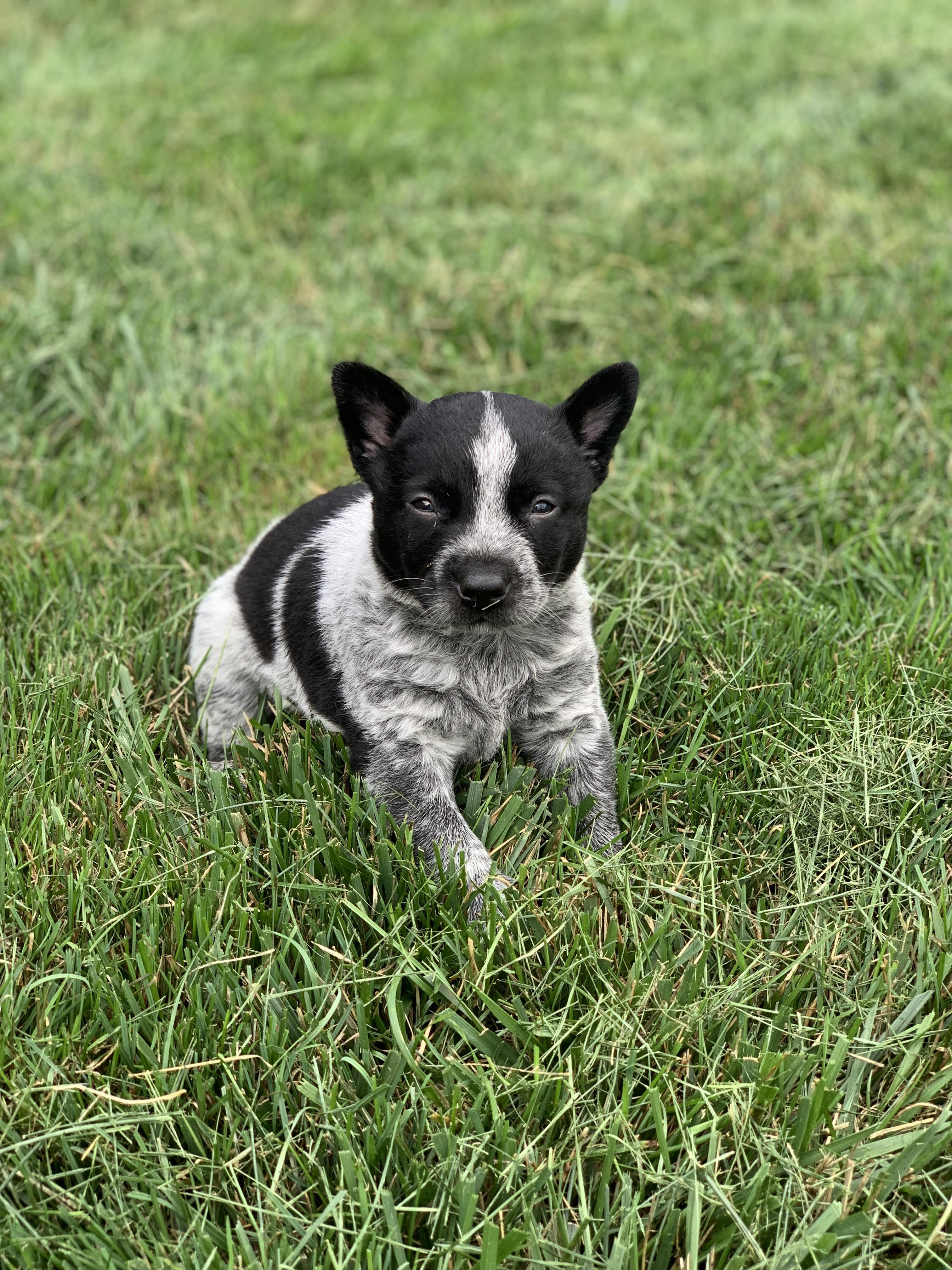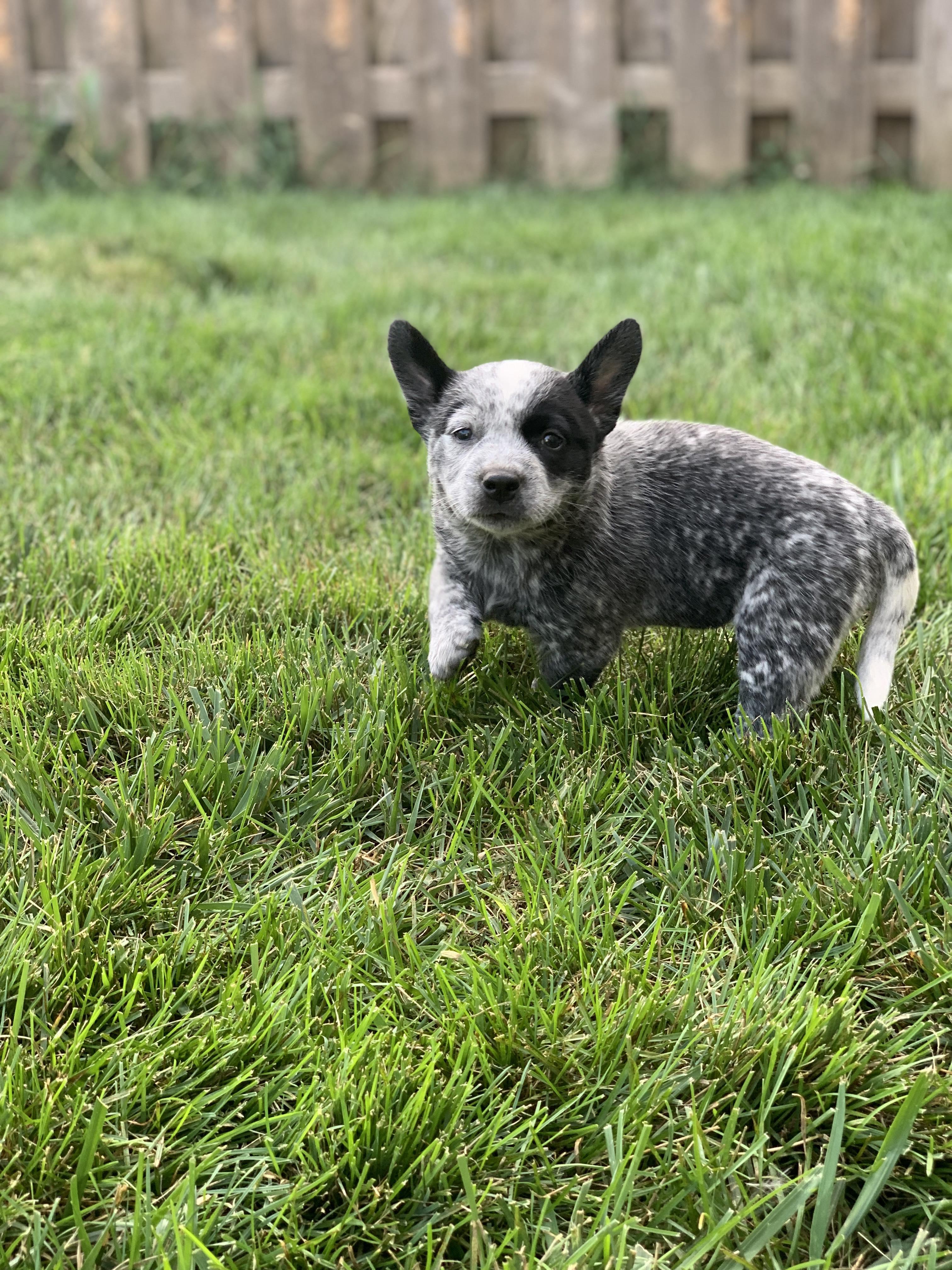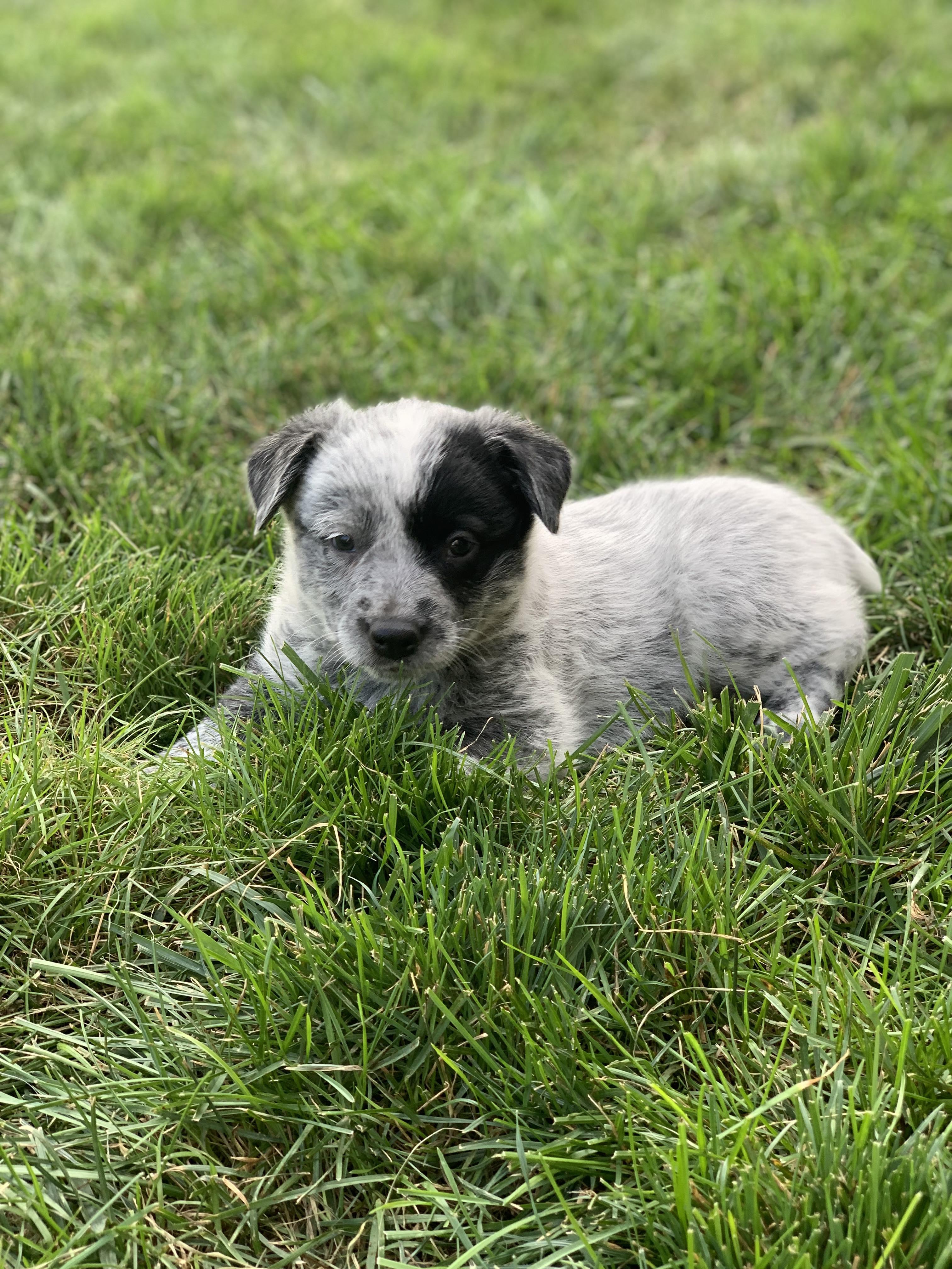 Poppy is a fun loving, but gentle, cattle dog with a lot of personality. She loves to help with farm chores and is always interested in things going on around her. She is a true Blue heeler with no tan points, a mostly full mask, and no body or tail spots. She comes from a line of dogs out of Missouri bred by Piney River Cattle Dogs.
