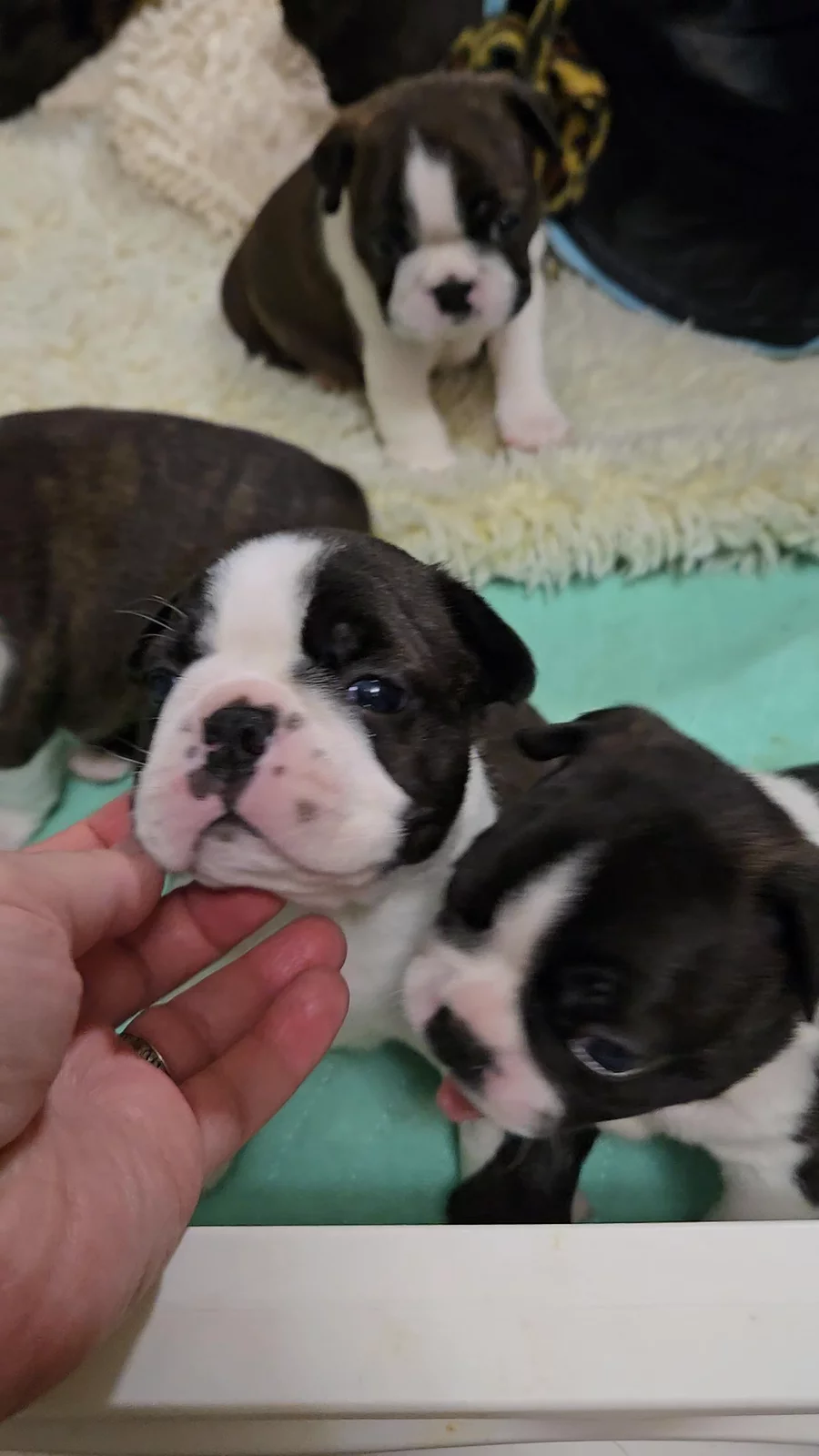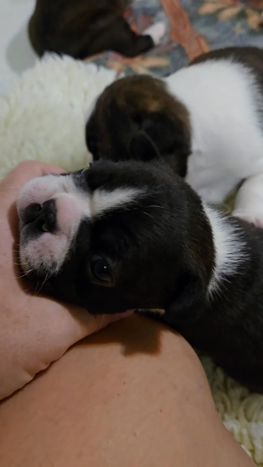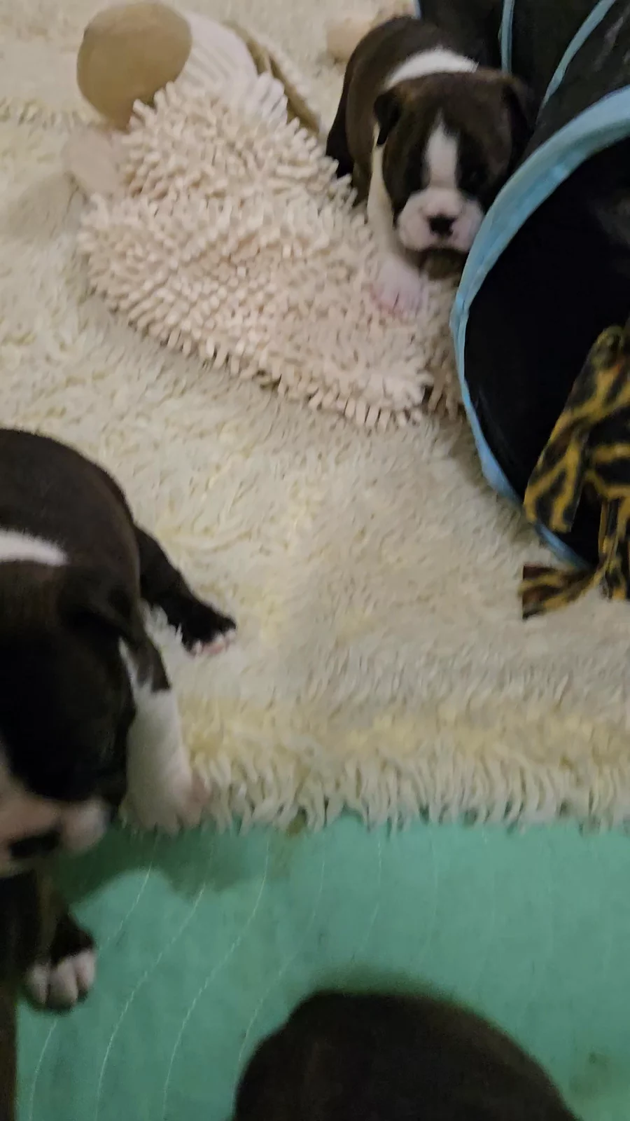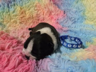 Our Boxer puppies include fawn, brindle, and white. Boston Terrier puppies include seal brindle and white, brindle and white, and black and white. Colors will vary depending on the parent dogs.