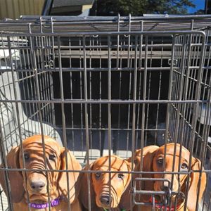 - Pictured in the crate is White (green collar because I ran out of white ones), Blue, Purple, and Rose (red collar) -
