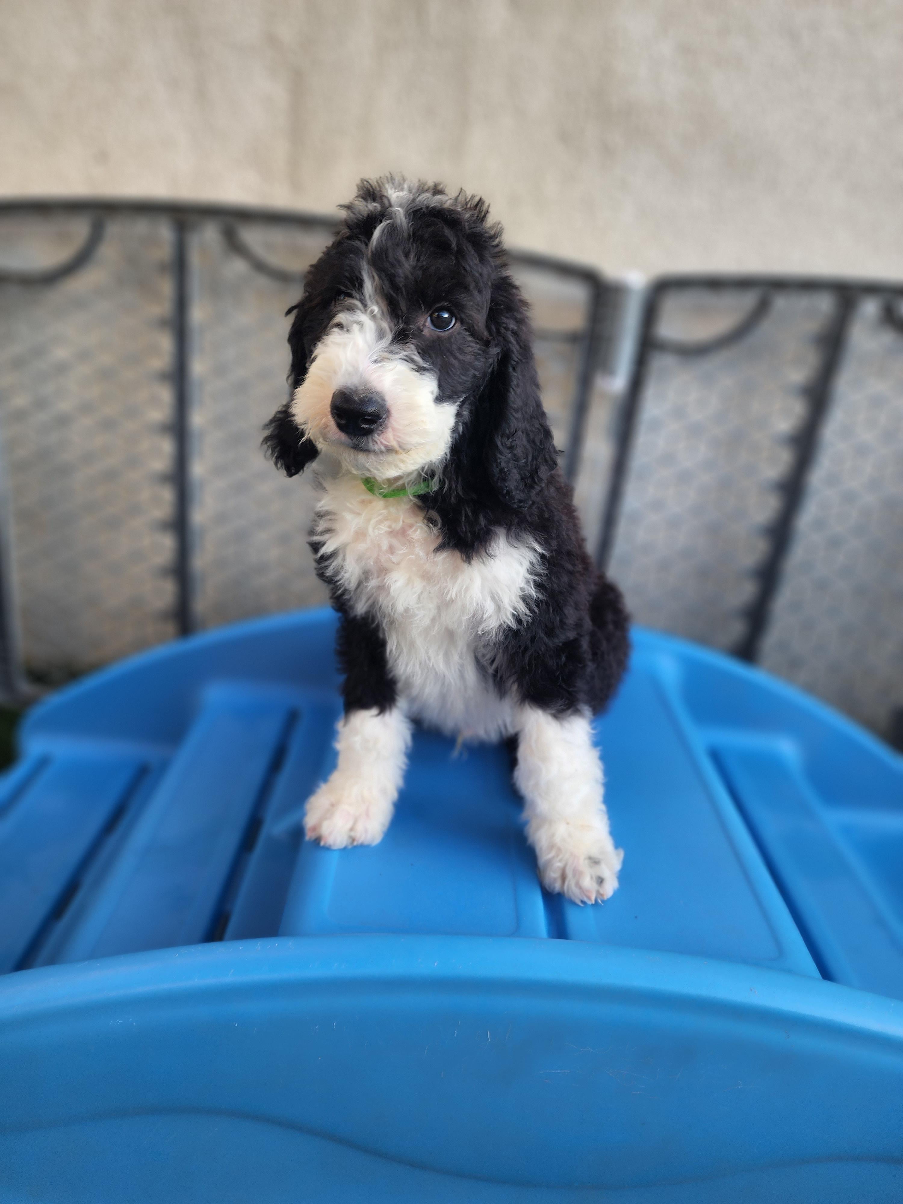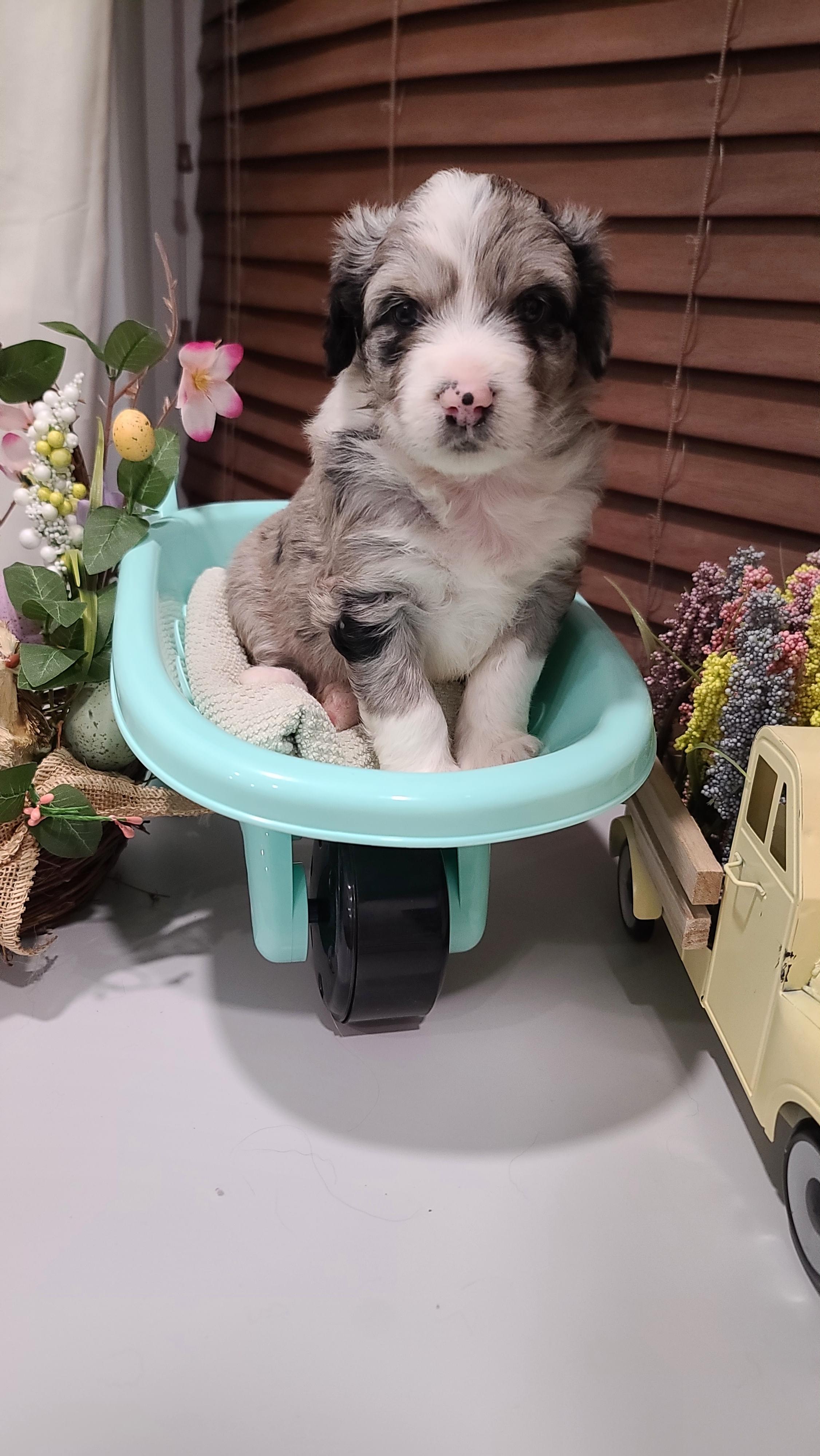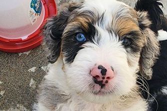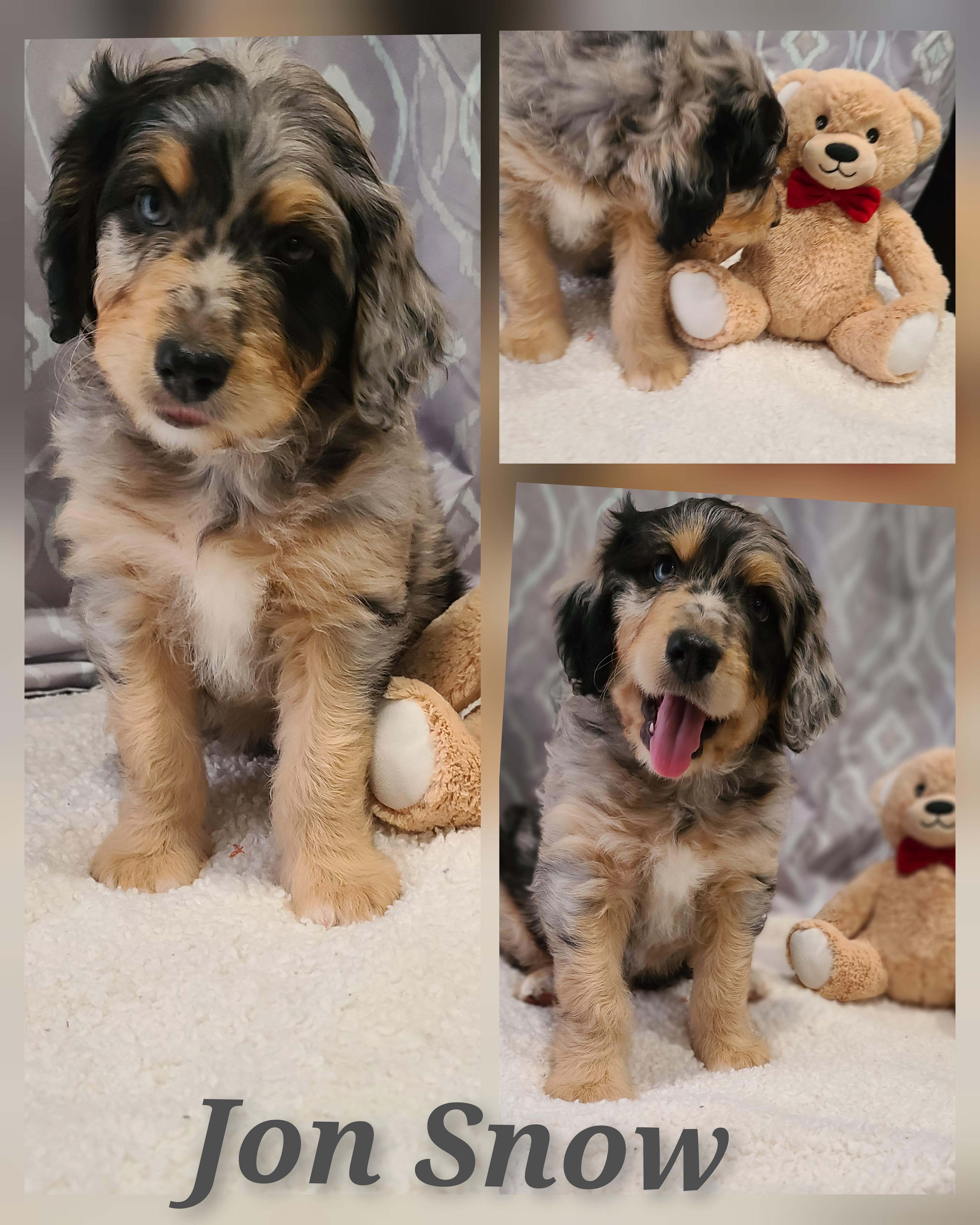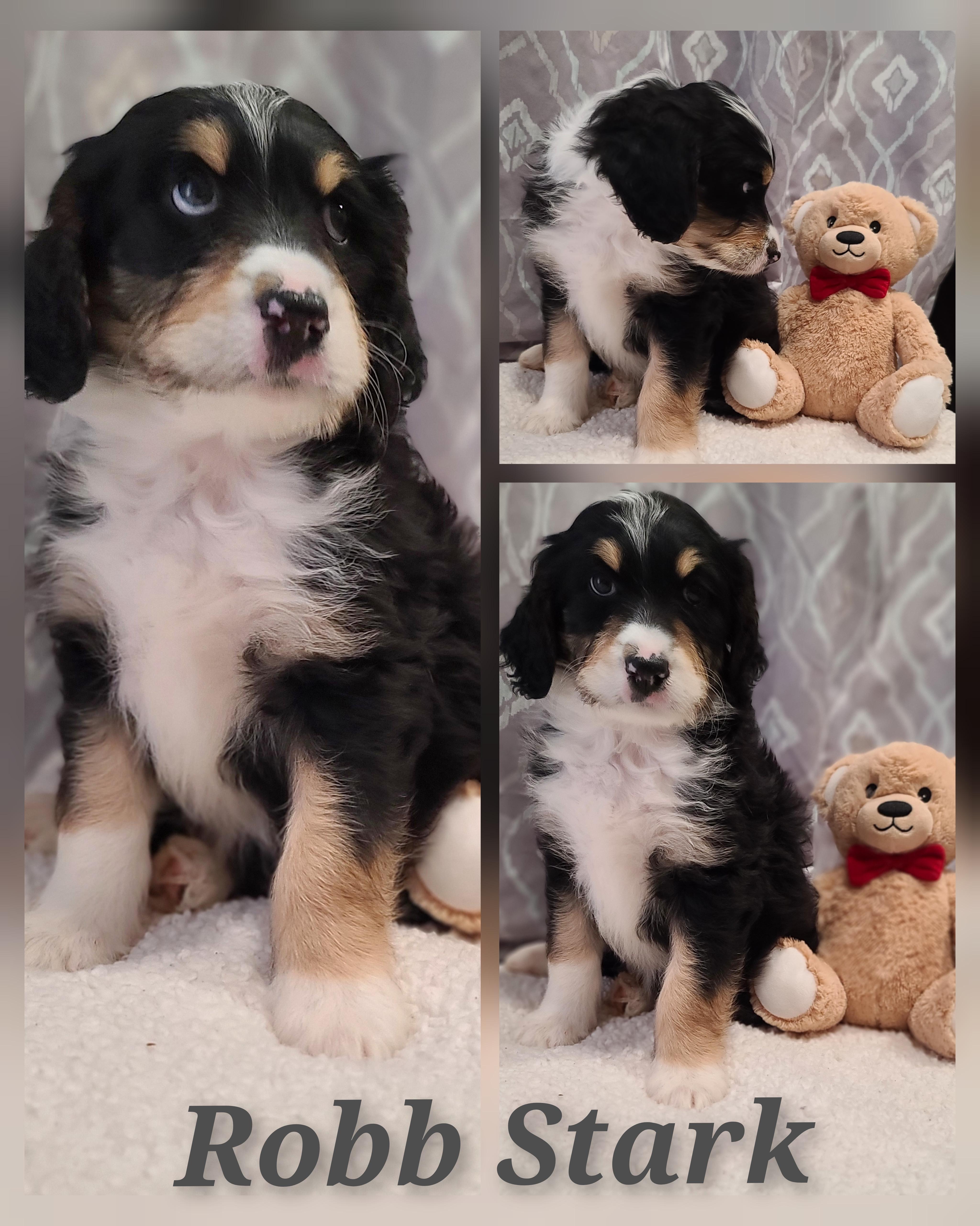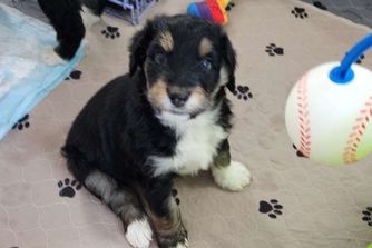 Our Bernedoodle puppies include tri-color and phantom. Goldendoodle puppies include apricot, red, and chocolate. Aussiedoodle puppies include black and white and black tri-color. Colors will vary depending on the parent dogs.