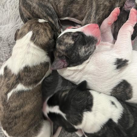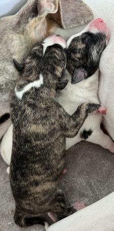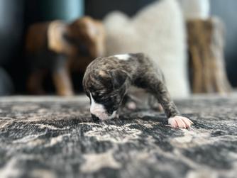 Our puppies include white and fawn brindle, blue brindle, fawn brindle, and black brindle. Colors will vary depending on the parent dogs.
