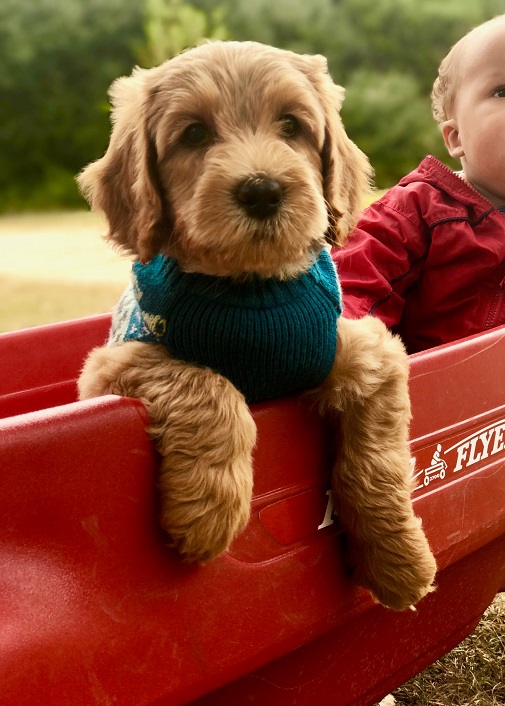 Mr. Gumbo Cajun Spice is the newest boy in our family. He's a medium size Australian Labradoodle with a red fleece coat. He's full of energy but still maintains good listening attentiveness with sit and commands. Gumbo is eager to work and please us with all his tricks or just upon command to impress us with what he can do.