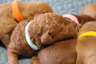 Our Bernedoodle puppies include sable, black and white, tri-color, and phantom. Poodle puppies include sable, apricot, black, brown, red, parti, phantom, and brindle. Goldendoodle puppies include cream, apricot, red, chocolate, phantom, and parti. Colors will vary depending on the parent dogs.