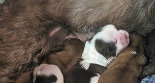 Our puppies include black, liver, black and white, gold and white, and brindle. Colors will vary depending on the parent dogs.