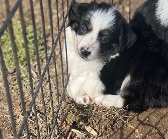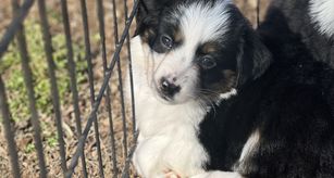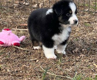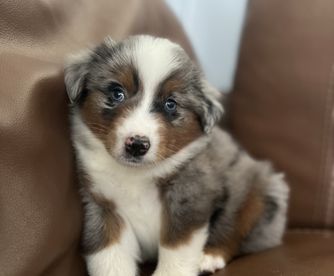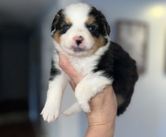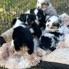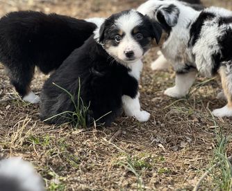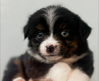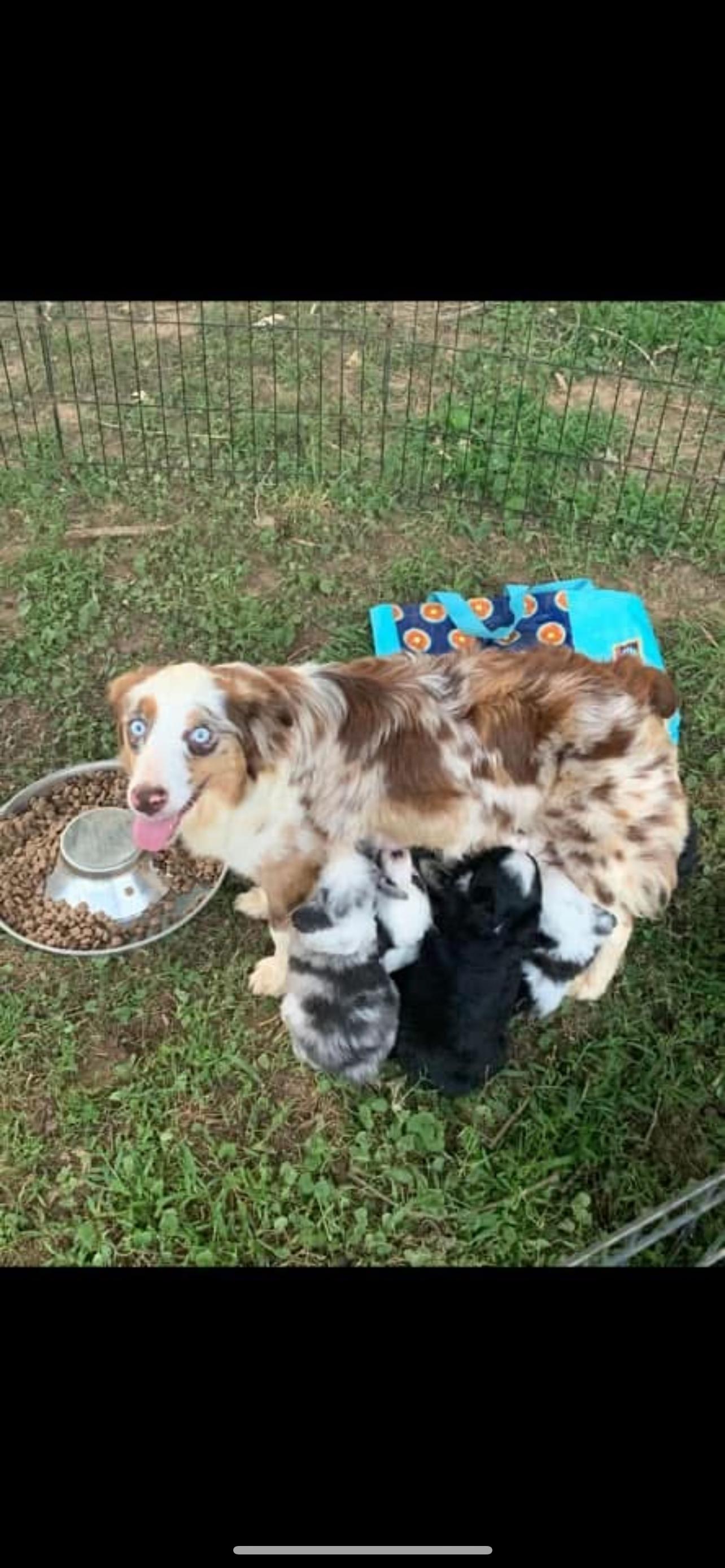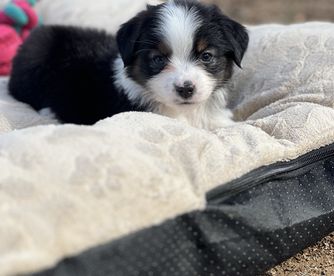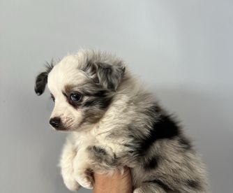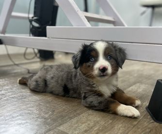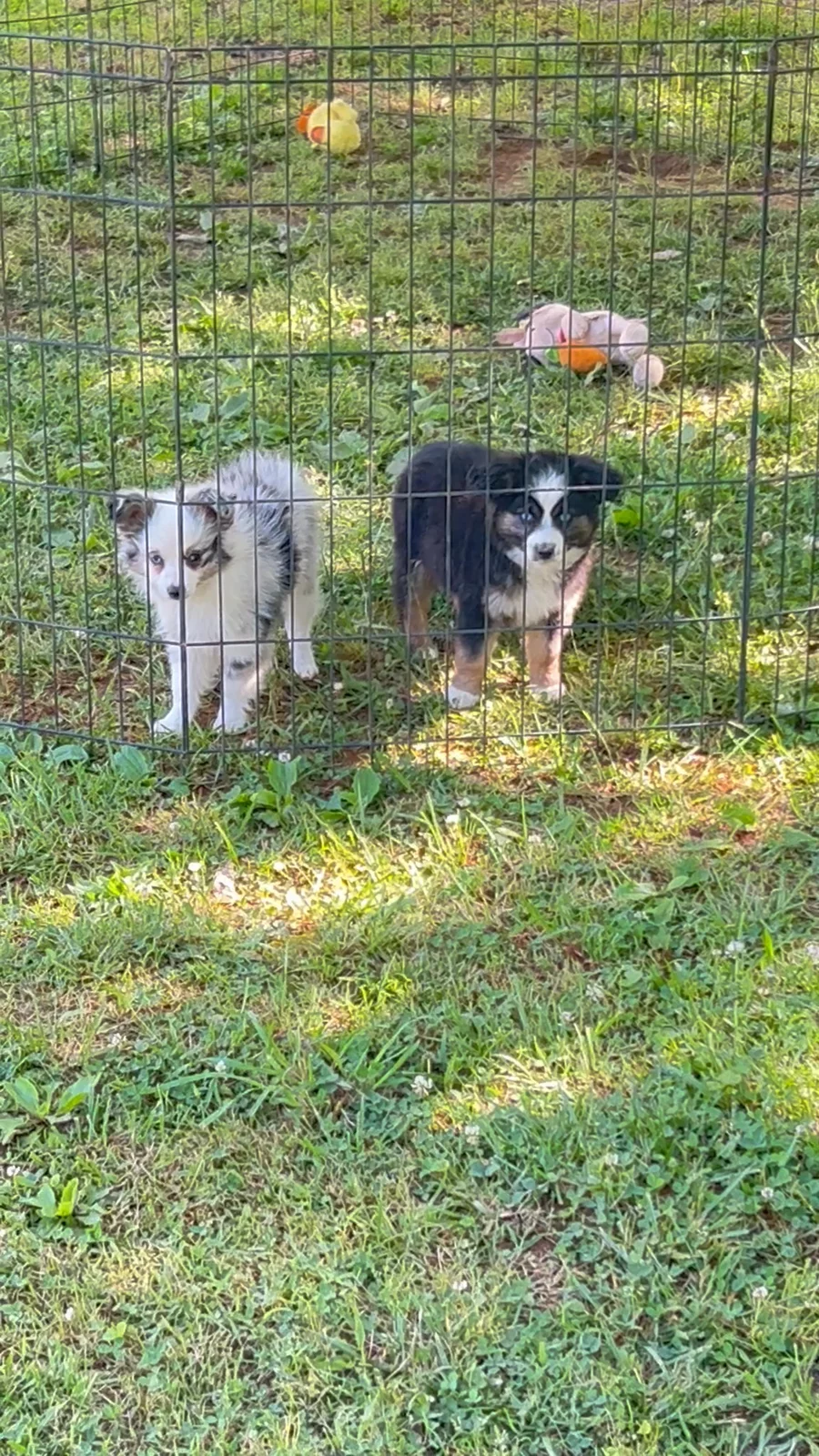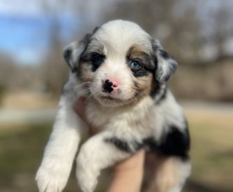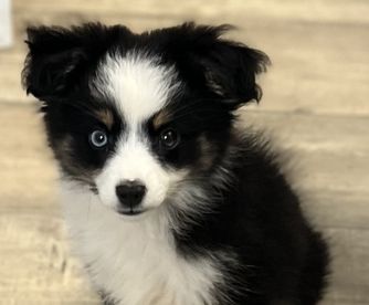 Our Toy Australian Shepherd puppies include black tri and blue merle. Miniature Australian Shepherd puppies include blue merle, black tri, red tri, and red merle. Colors will vary depending on the parent dogs.