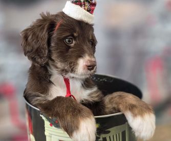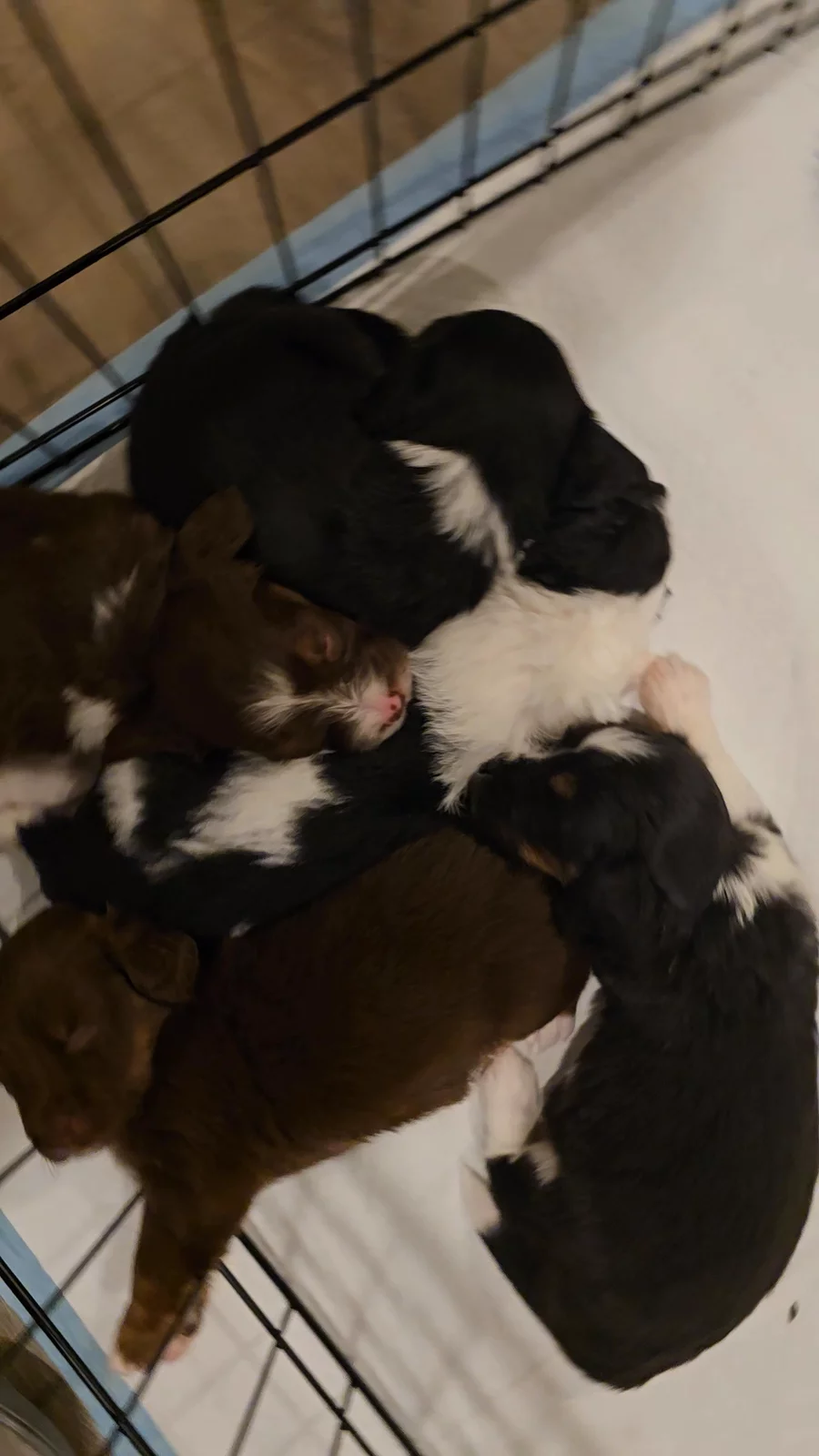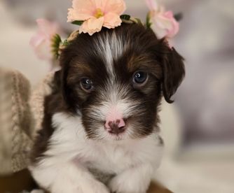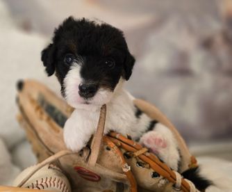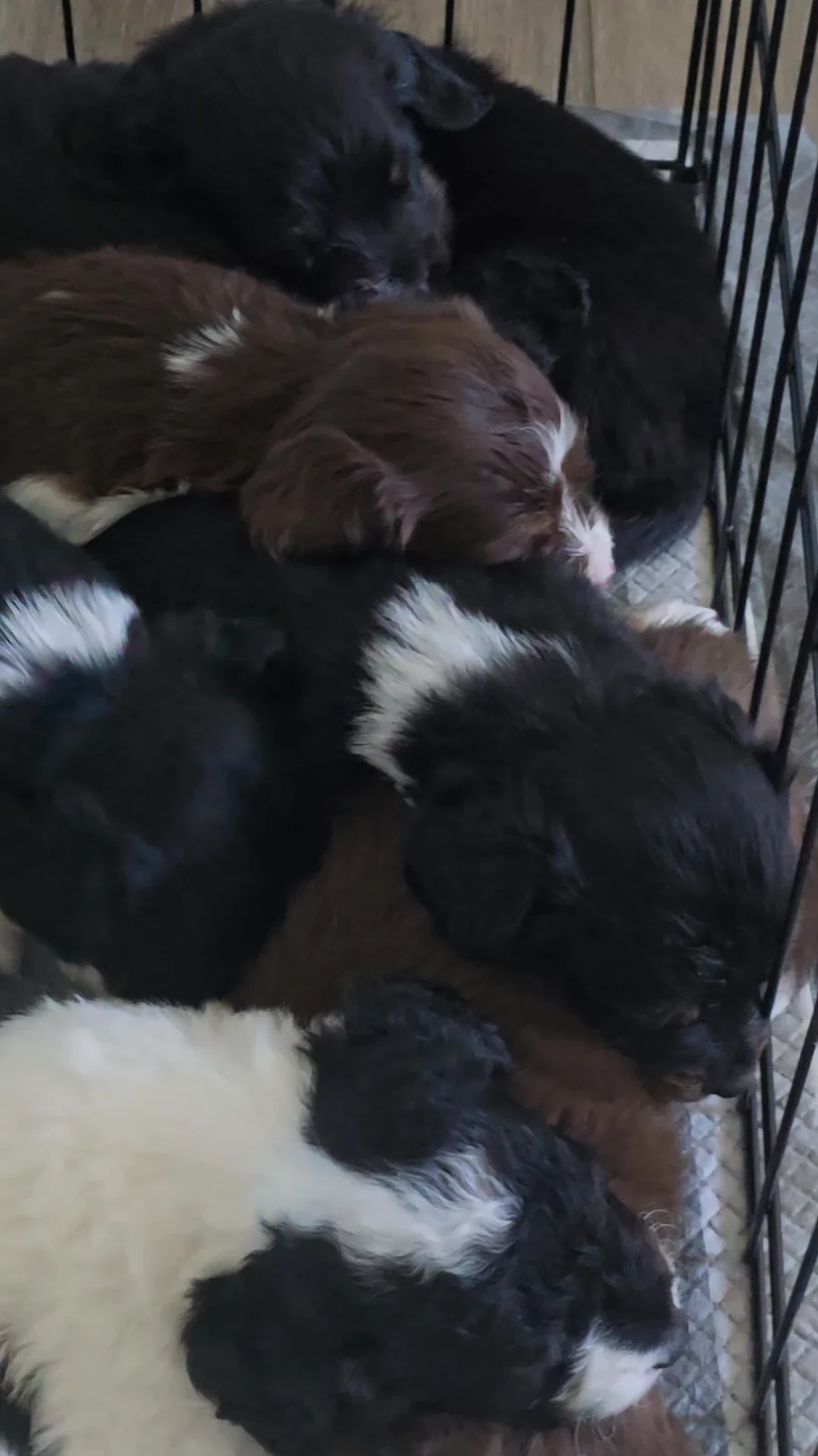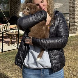Our Aussiedoodle puppies include brown and white, red merle, black and white, and black tri-color. Double Doodle puppies are tri-color. Colors will vary depending on the parent dogs.