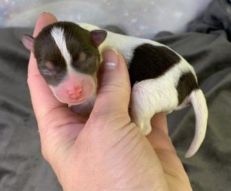 Gabby is a 3 year old mini chocolate tan white out of my Maya (blue tri)
