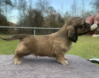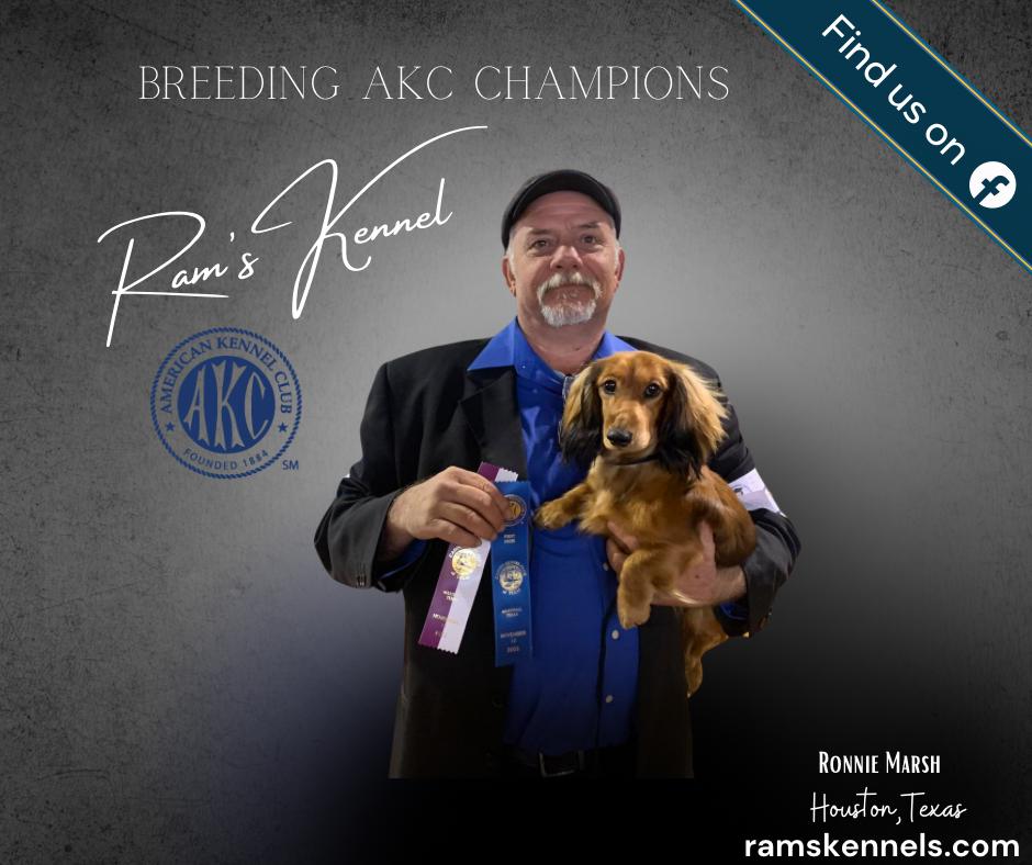 I'm Ronnie M., the breeder behind Ram’s Kennels located in Splendora, TX. We raise AKC long haired Dachshunds. Our program focus includes breed preservation,conformation, health, and temperament. Day three we start Early Neurological Stimulation (ENS) until day 18. -Puppies are socialized/well adjusted -Go home 10 weeks -We offer show prospects/pets -Ram’s Kennel FB.
