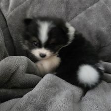 Tuxedo is a small, playful little boy with huge desire to please. His tri-colored coat is thick and silky and easy to maintain. He loves to hide his bones and play outside with his siblings. He is darling baby!