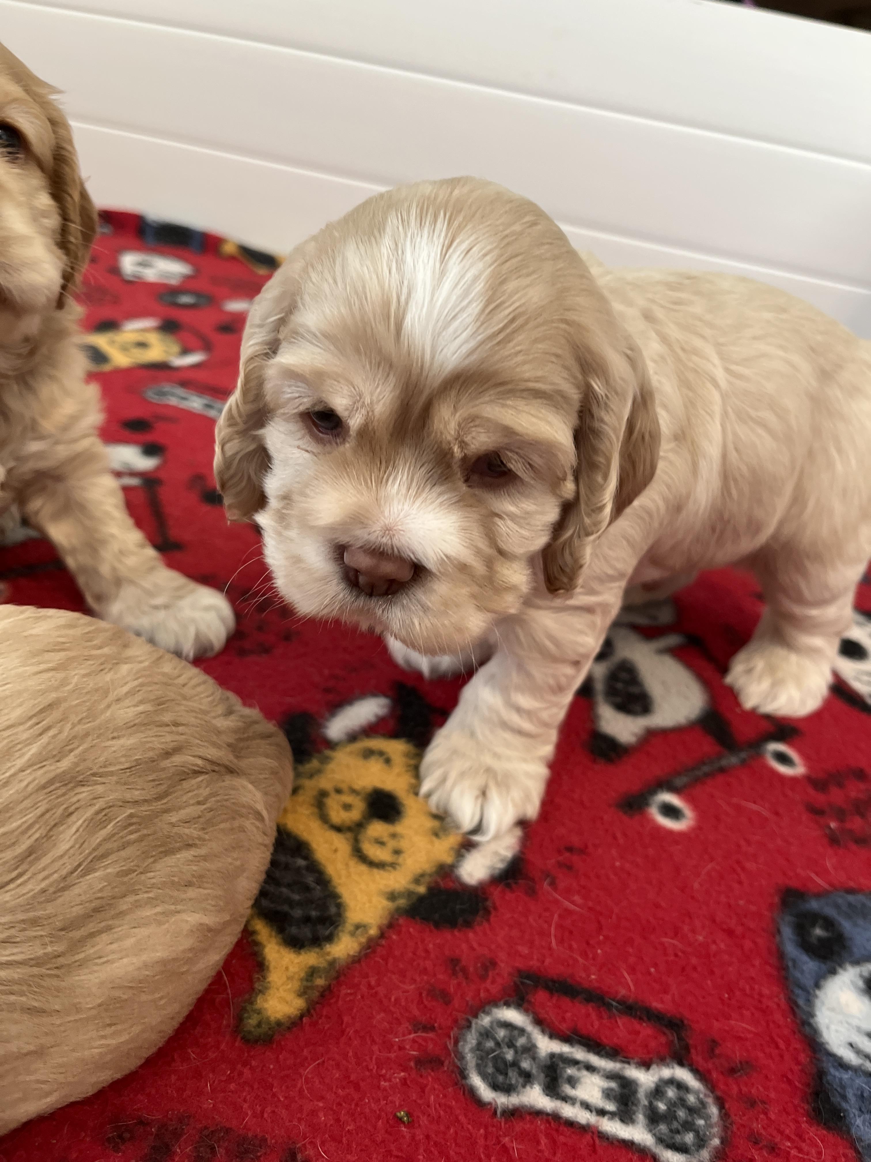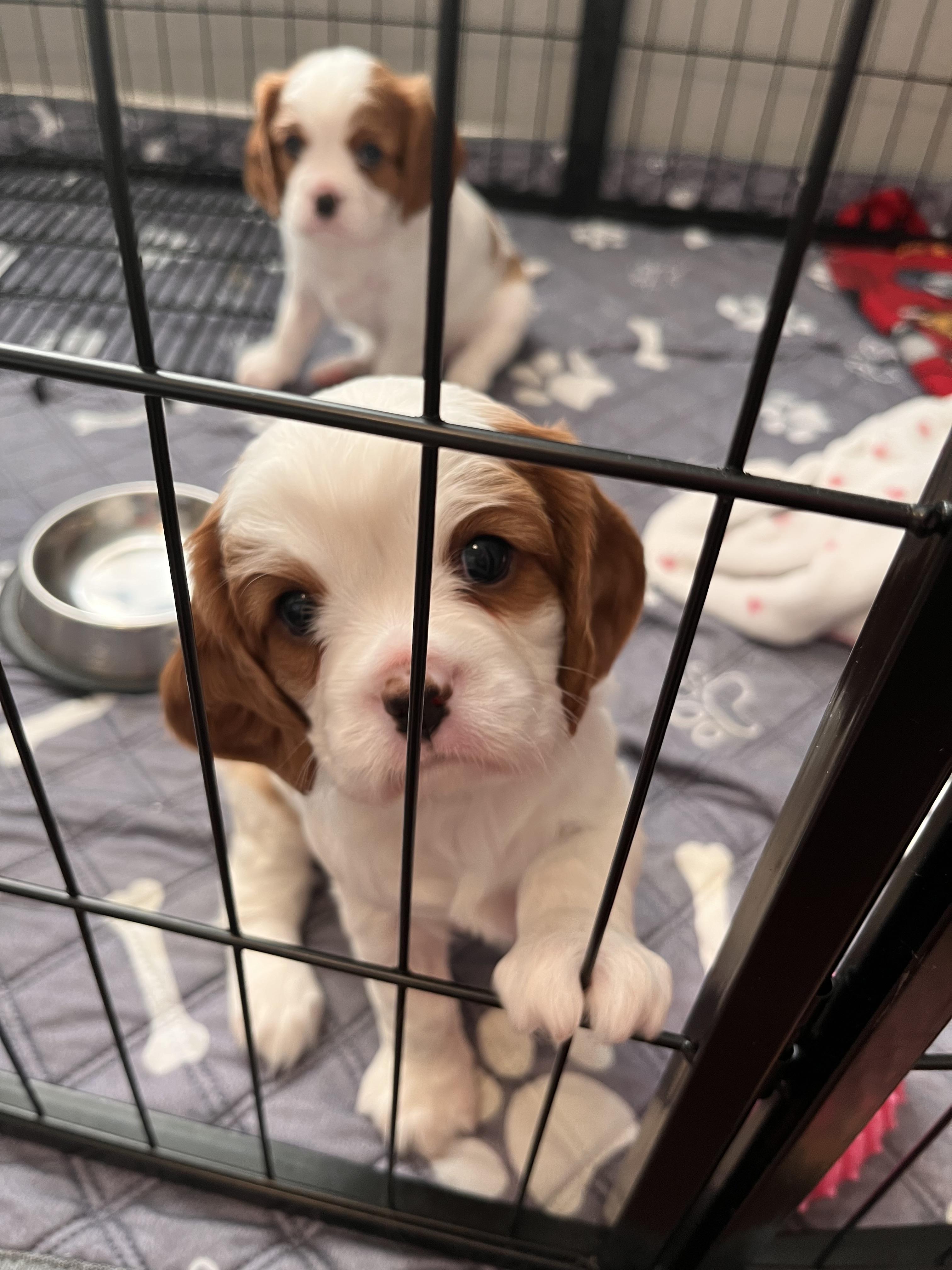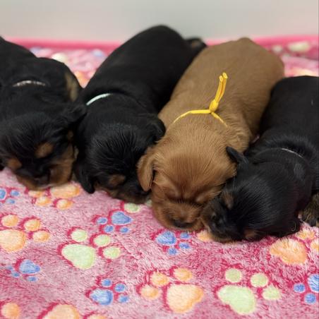 Our Cocker Spaniel puppies include black, black and white, buff and white, red, and buff. Cavalier King Charles Spaniel puppies include blenheim, ruby, black and tan, and tri-color. Colors will vary depending on the parent dogs.