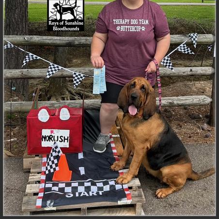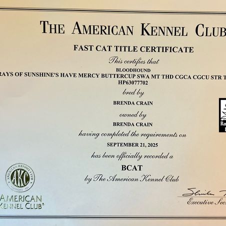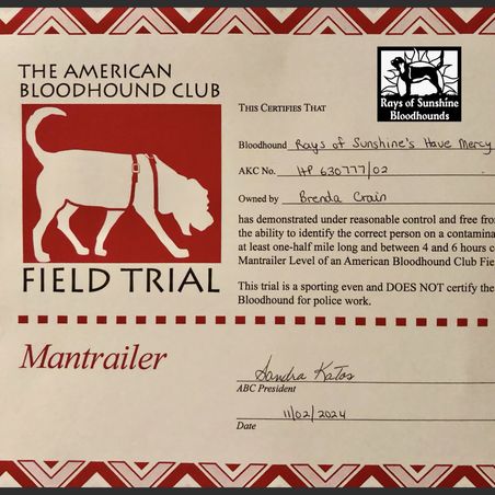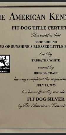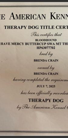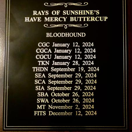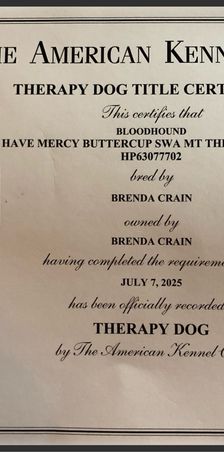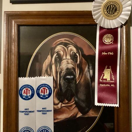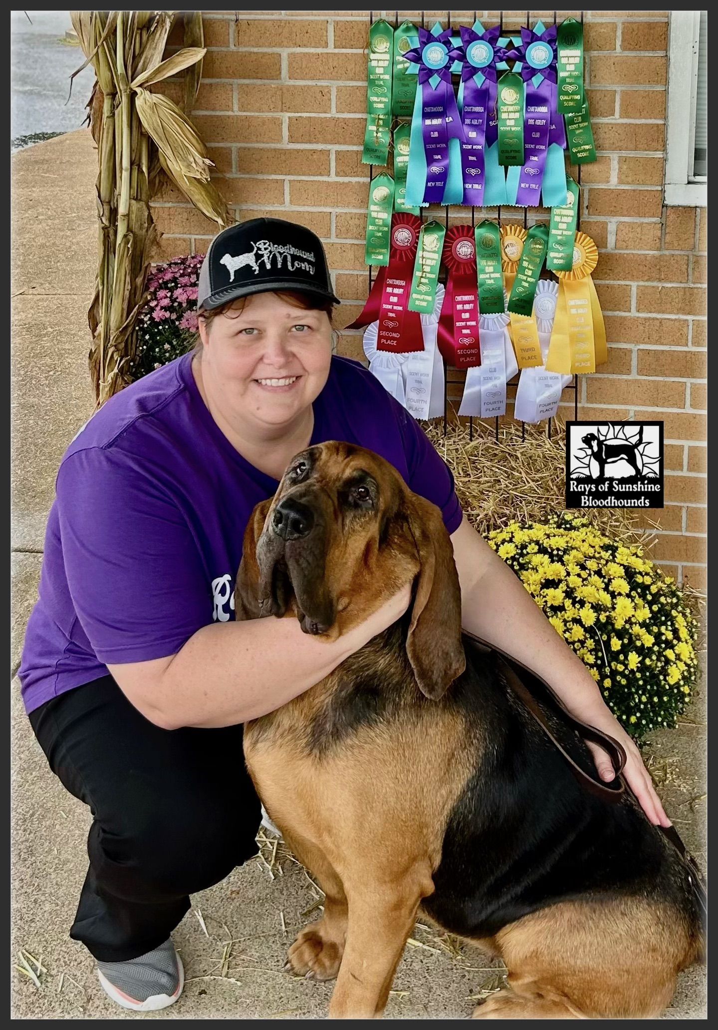 I'm Brenda & Chris C., the breeder behind Rays Of Sunshine Bloodhounds located in Pelahatchie, MS. For the past 15 years we have been owned by 7 different Bloodhounds and fell in love with 3 litters of puppies. We were so impressed with our second litter we kept a black/tan female and named her Buttercup. I began training Buttercup at any early age in the AKC S.T.A.R. puppy program. Soon after she graduated, we started AKC Scent Work - where she truly shines! She earned many titles including Buried, Container, Interior, Exterior & level titles for Novice & Advanced. Buttercup got 1st place in many trials and amazed us with her powerful nose. She also enjoys being active earning the Fit Dog Bronze & Silver title along with the ManTrailing title from the American Bloodhound Club. Her latest accomplishment brings her total number of AKC titles to 21 including Canine Good Citizen Advanced & Urban, Trick Dog and Therapy Dog after becoming a certified therapy dog last summer. She loves to make new friends with every therapy visit. We have also been in the conformation show ring where she earned Winners Bitch & Best of Opposite. Buttercup also passed recommended Parent Club health testing, receiving her CHIC at 2 years old. We love our Bloodhounds and continue to work hard expanding our program.