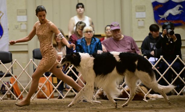 Cannon is tall, elegant, and a quintessential borzoi. He runs like his life depends on it and he is gentle with his family with young children at home. When he is not strutting his stuff in the show ring or chasing plastic with all the heart he can muster, he can be found happily snoozing at home on his bed or under the chair of his youngsters to catch any falling goodies