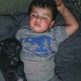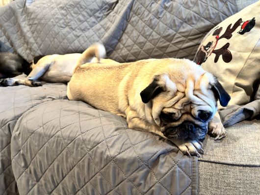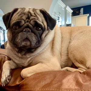 Archie is our good boy. He was named "Almond Joy" buy his breeder, Vargas Pugs in Odessa Texas and Joy certainly speaks to who he's been with us. We got Archie at 14 months old, when the breeder didn't really see themselves parting with him, but our family was a fit and we're so lucky to have him.