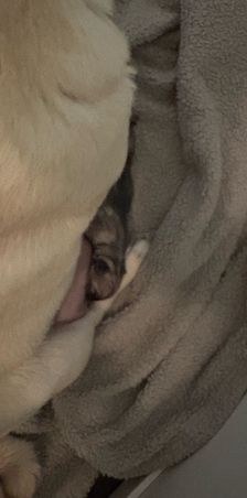 McGonagall reminds me of Fin (aka Big Hass) from Petunia’s last litter. He hasn’t been weighed yet but he’s definitely the biggest of the litter and eating like a champ at less than 20 min old.