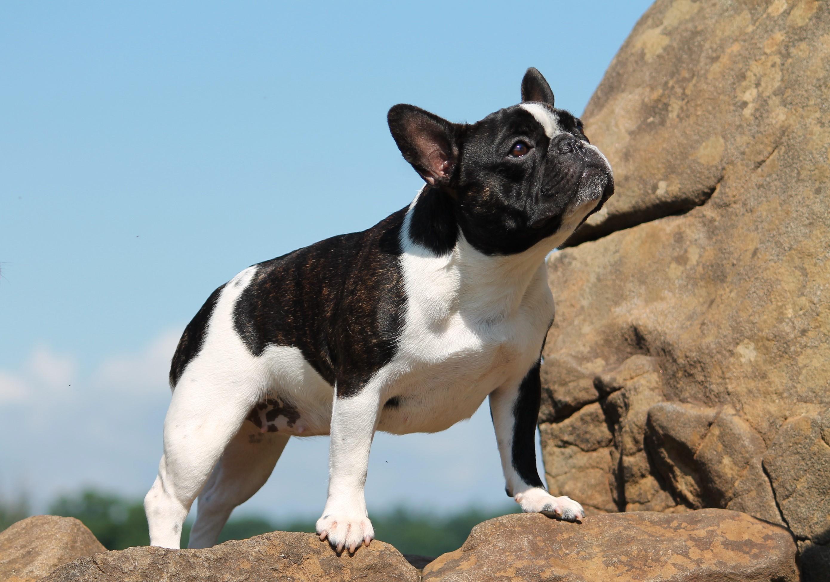 Sassy little pied bitch that can perform in the conformation ring as well as hang as an athlete (which she prefers). Fun, no nonsense girl with typical Frenchie devotion.