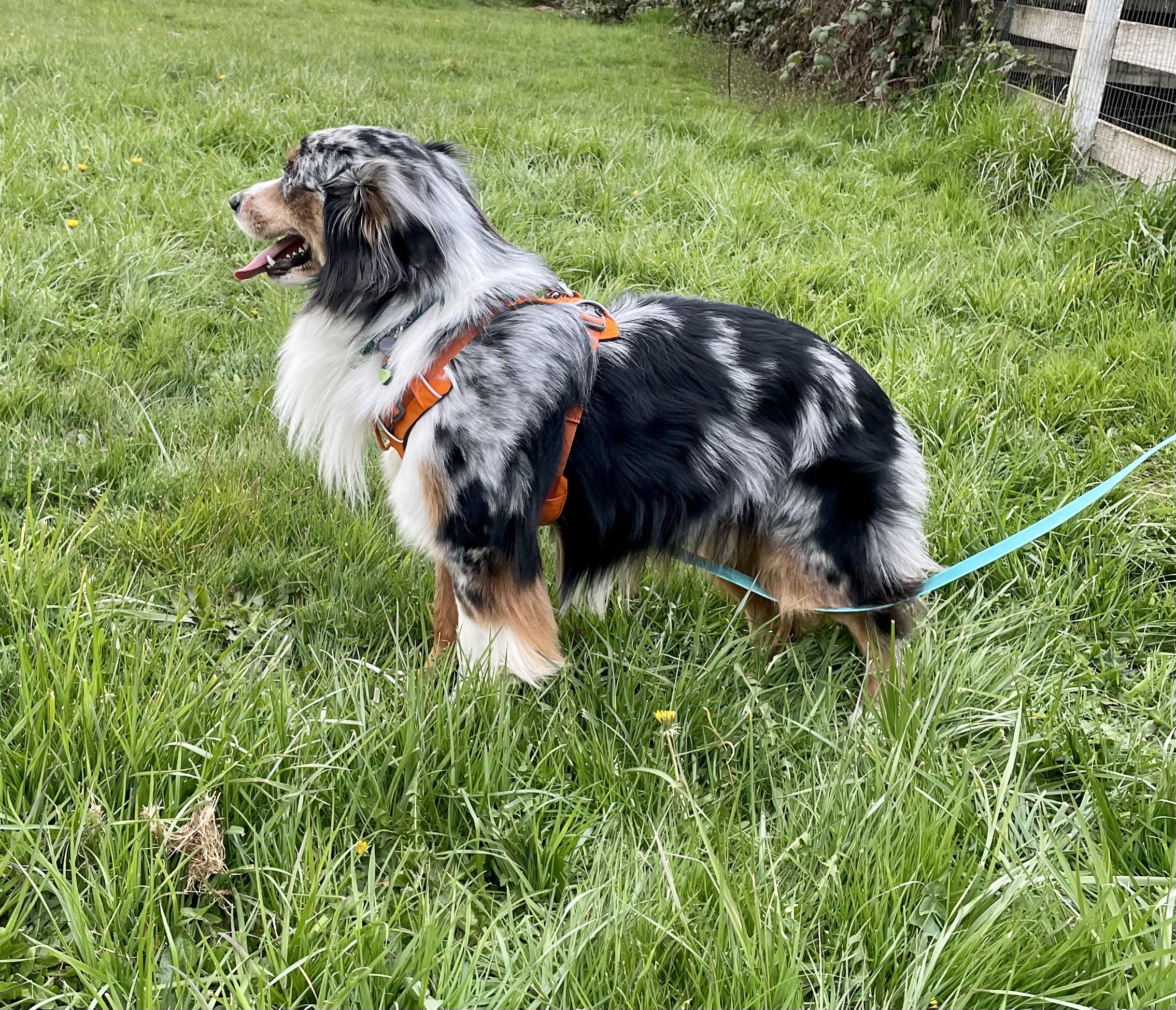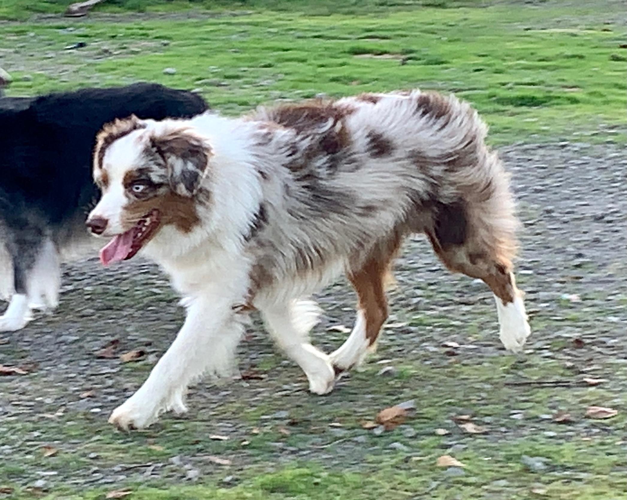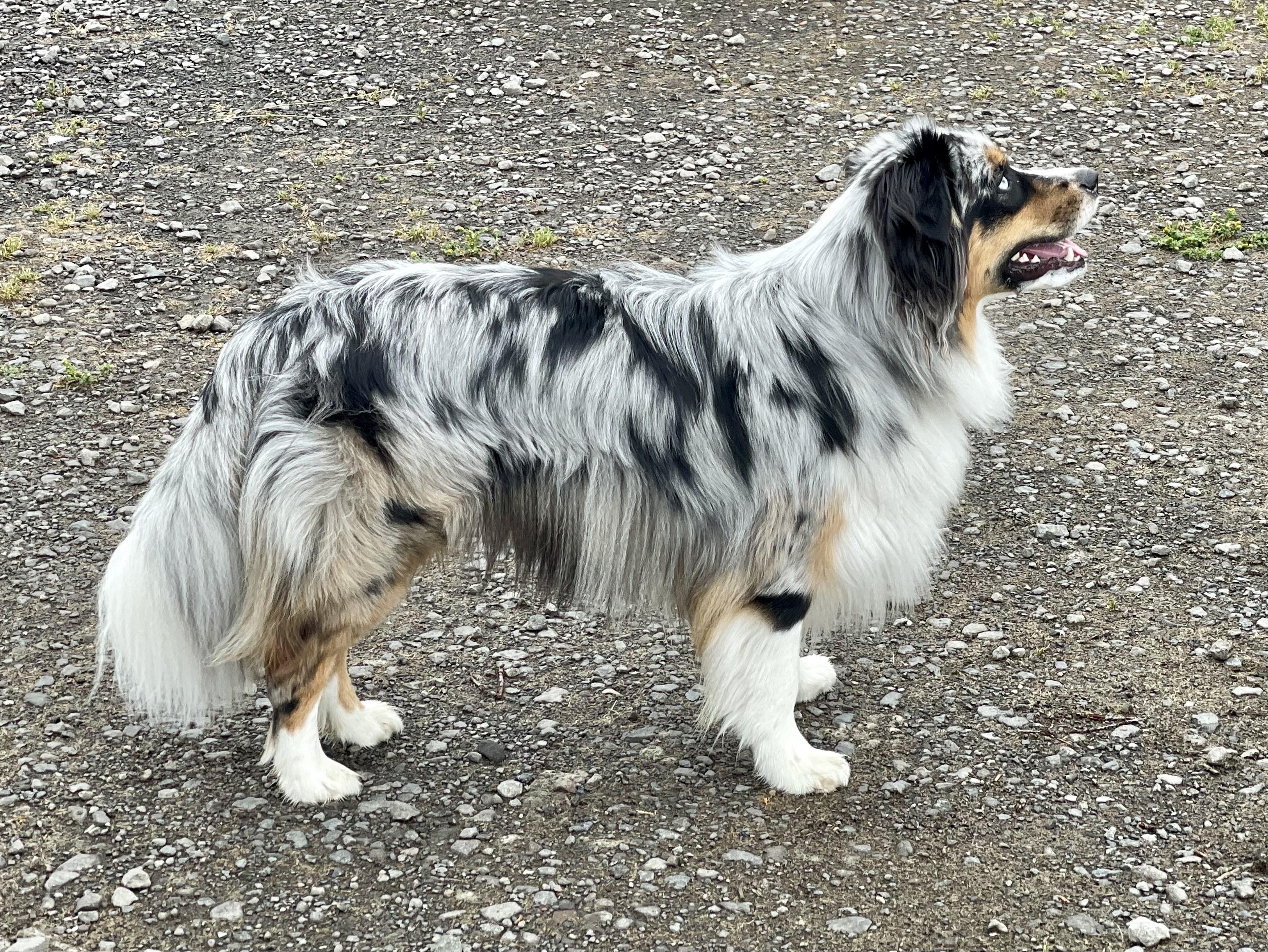 Tinner is a stunning red merle bi boy with an amazing disposition. He’s always eager to please and has never met a stranger. He loves everyone! Tinner has a strong, muscular build and excellent structure. He’s also a playful goofball who gets along well with other animals. Incredibly smart and well behaved, Tinner is the total package.