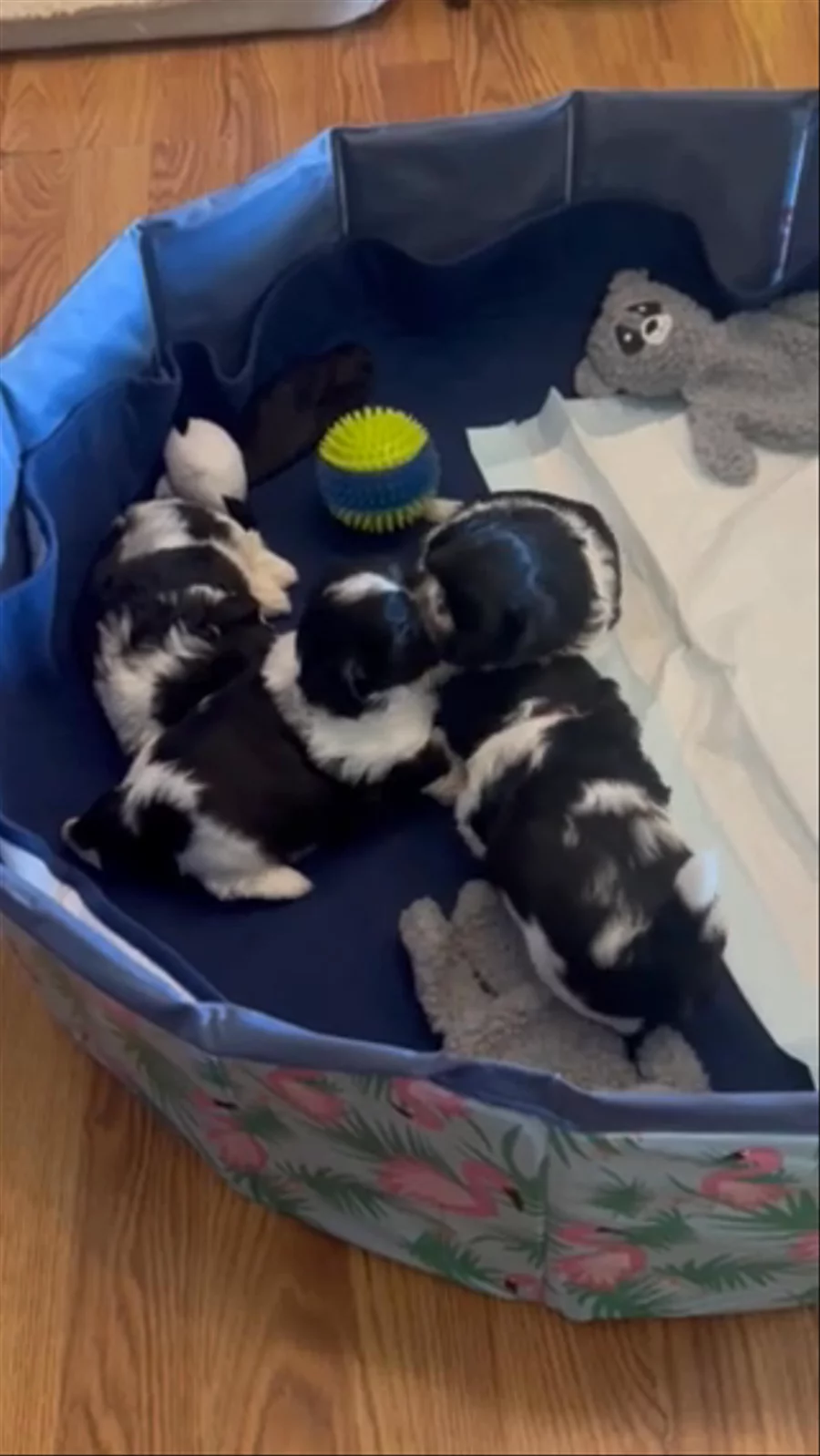 Puppies are 6 weeks old! They had their first bath tonight. For the next two weeks we are working on zeroing in on our potty training to a smaller area, learning new sounds and smells! 🥰