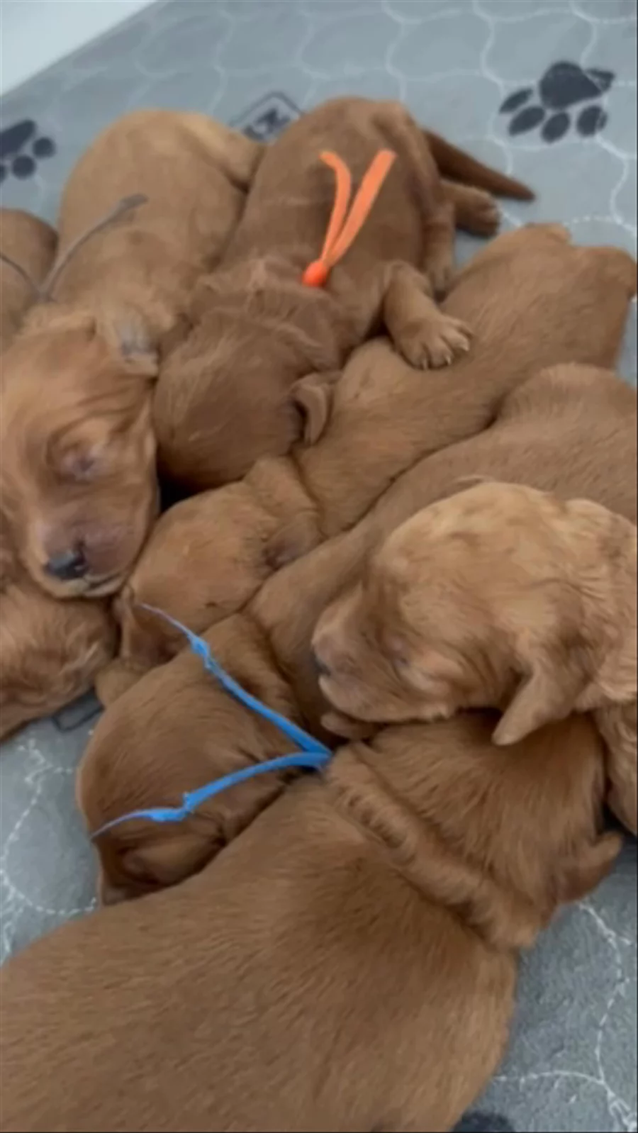 Cockapoo puppies include merle, brown and white, and brown roan. Goldendoodle puppies include apricot, red, chocolate, black, phantom, and merle. Labrador Retriever puppies are yellow. Colors will vary depending on the parent dogs.