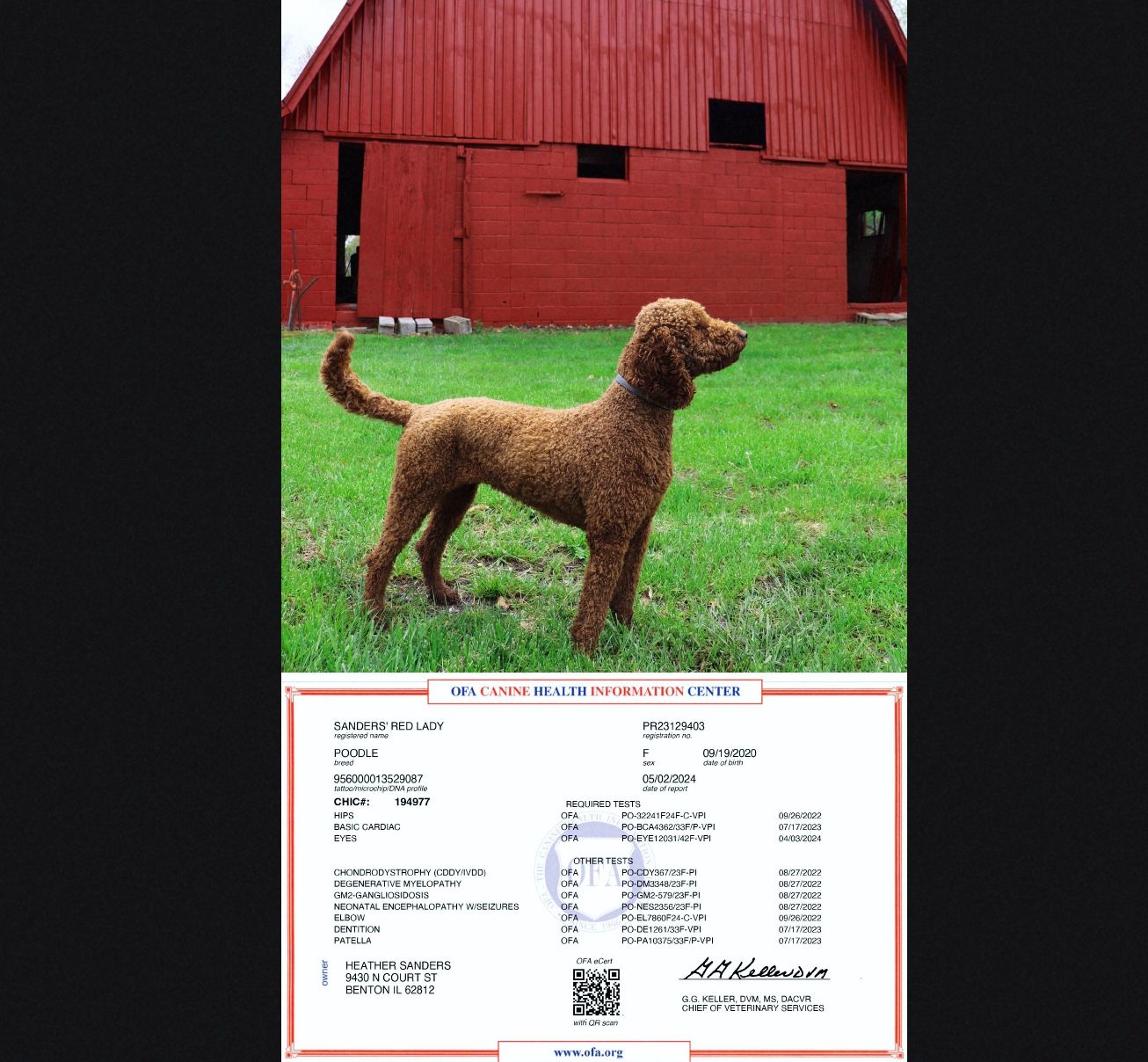 Red Barn Moyen Poodles reports to performing the health tests below on their breeding dogs. Ask your breeder about the tests performed on the parents of your litter. Learn more about health testing for Moyen Poodles.