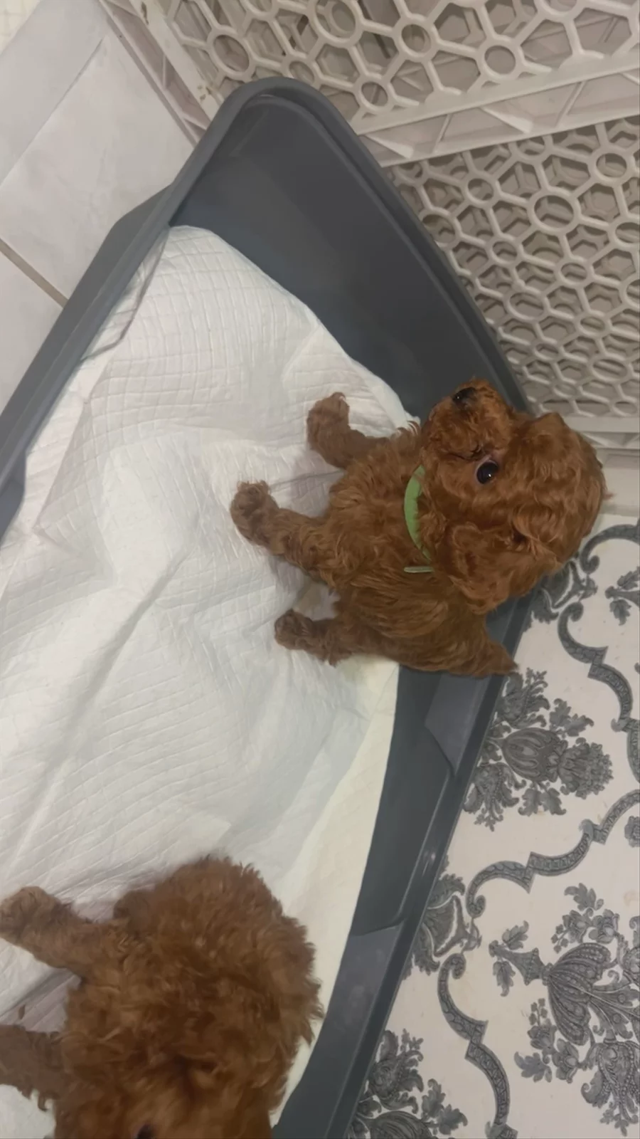 Puppies are learning to use the litter box, with a puppy pad on top. Some still prefer the flat surface of the puppy pad, but most are adapting very well!